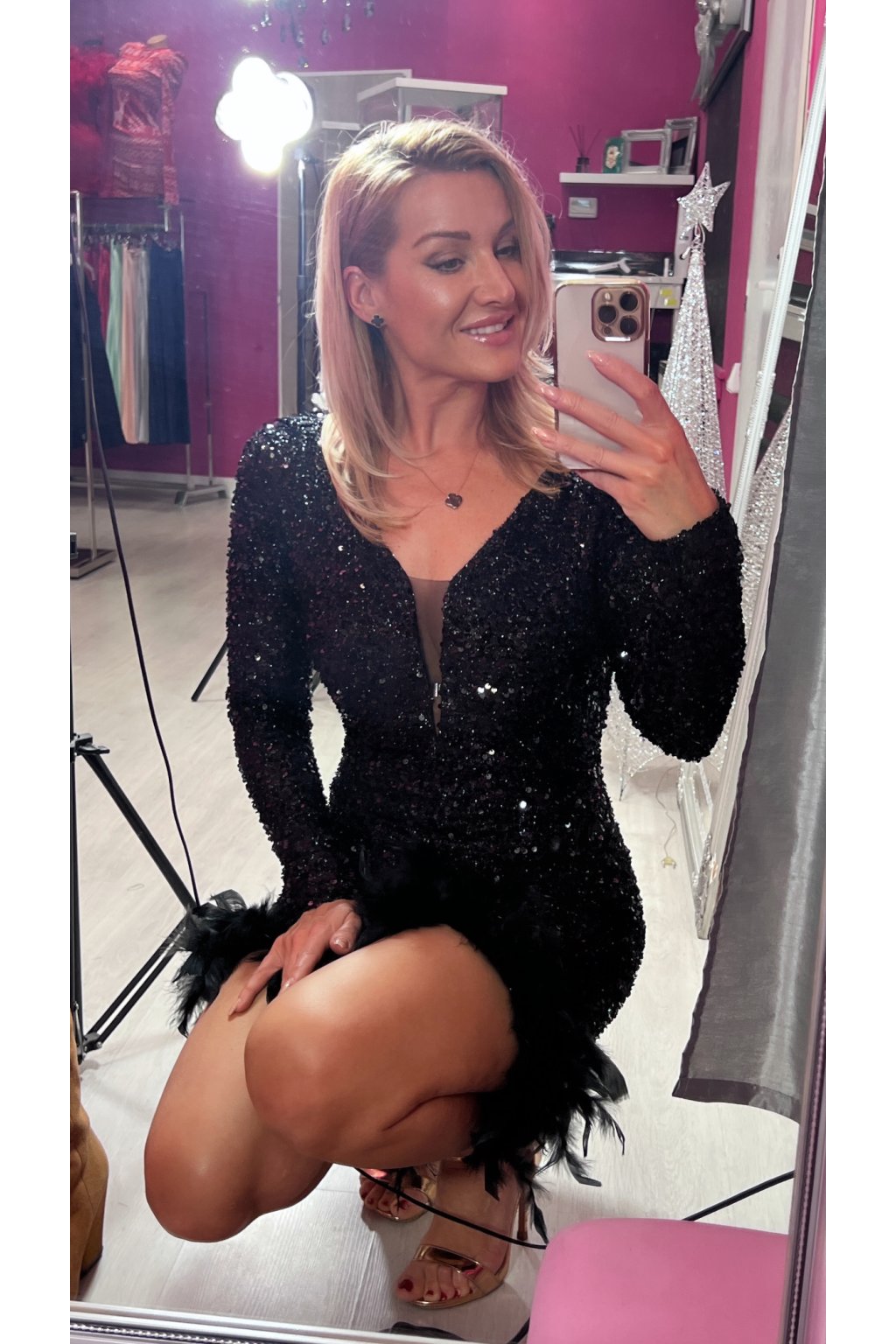 Mini šaty bohato zdobené flitrami po celej ploche vpredu aj vzadu okamžite upútajú pozornosť. Asymetrická mini sukňa zakončená jemnými pierkami dodáva modelu extravagantný a moderný vzhľad. Dlhý rukáv, tvarovaný výstrih vpredu aj vzadu a vnútorná výstuž zabezpečujú krásny tvar postavy aj maximálne pohodlie.