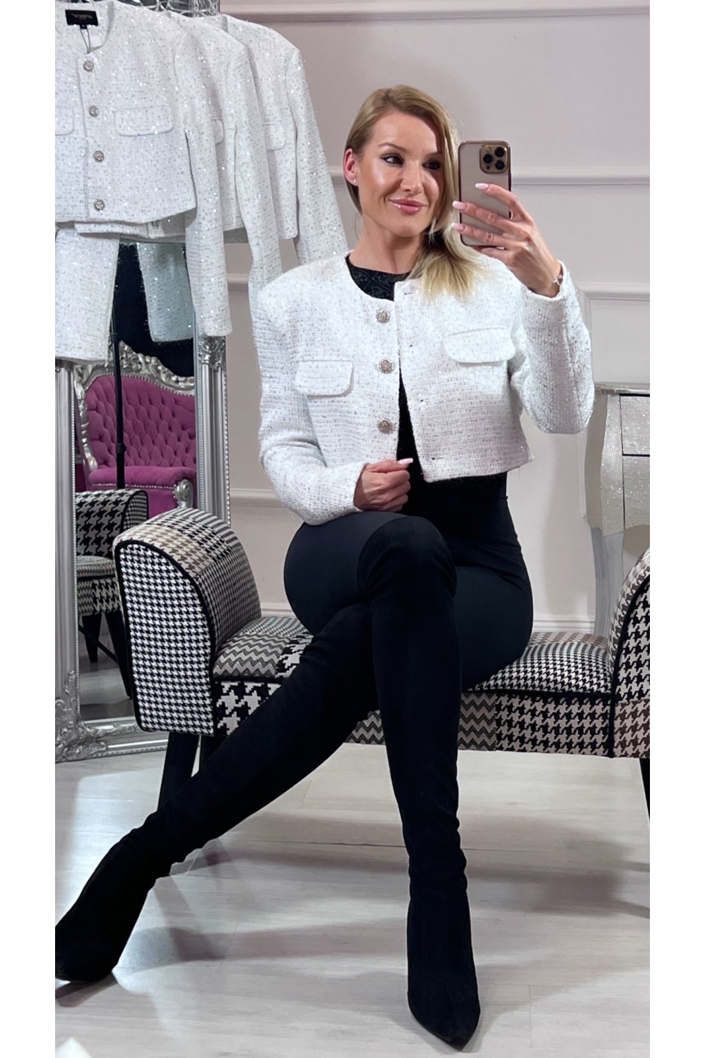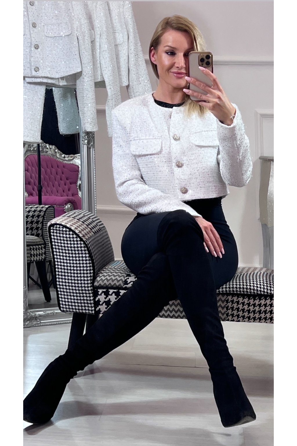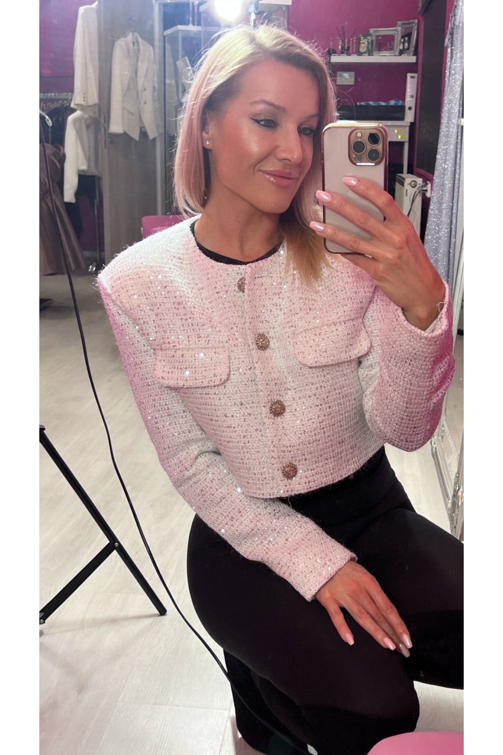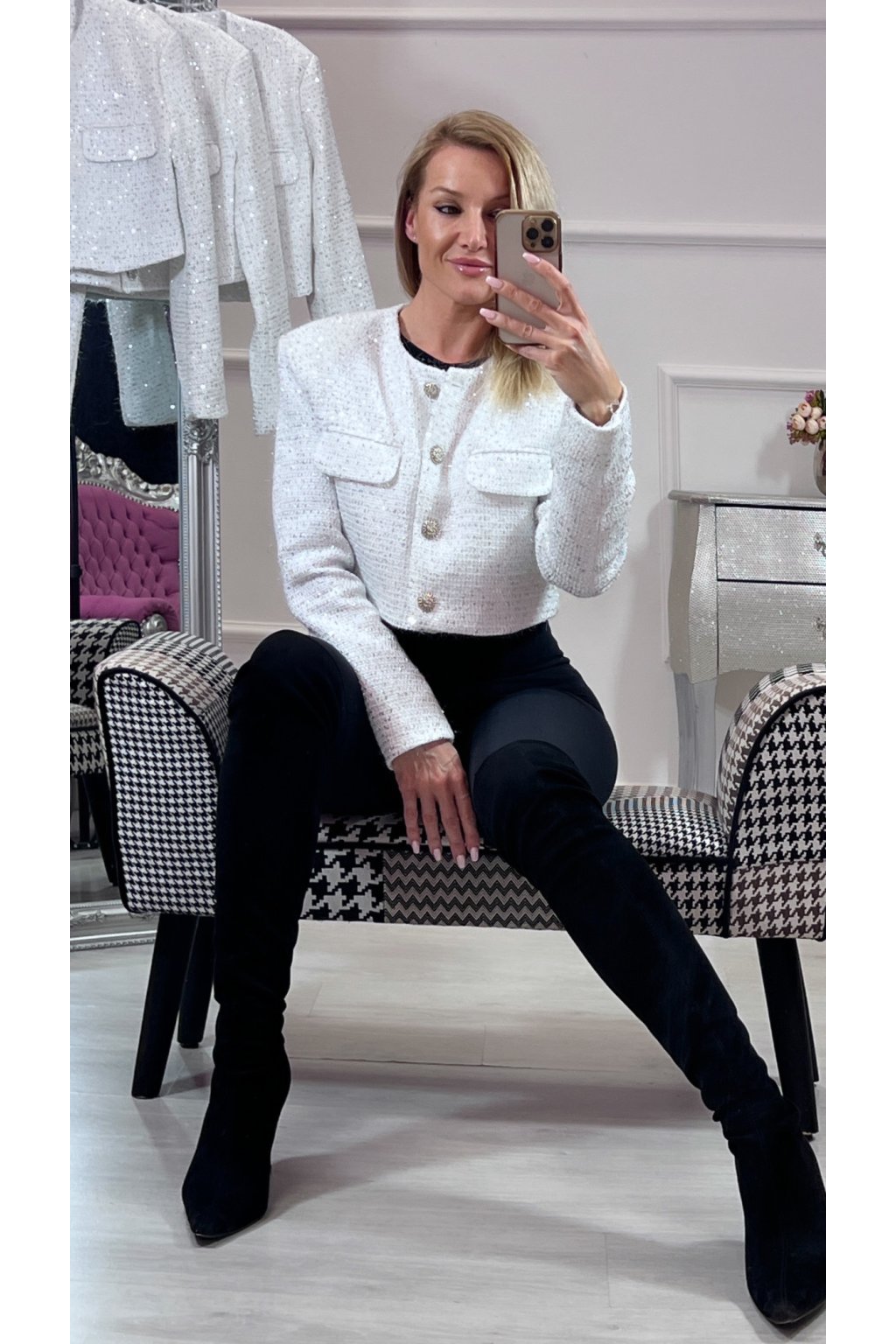 Elegantný krátky blazer z jemnej buklé tkaniny s decentným trblietavým efektom. Má okrúhly výstrih bez goliera, dlhé rukávy a výrazné ozdobné gombíky v striebornej farbe zdobené kamienkami. Prednú časť dopĺňajú imitácie náprsných vreciek s klopou. Perfektne sa hodí k šatám, sukni aj nohaviciam – ideálny kúsok na spoločenské udalosti aj štýlové každodenné nosenie.