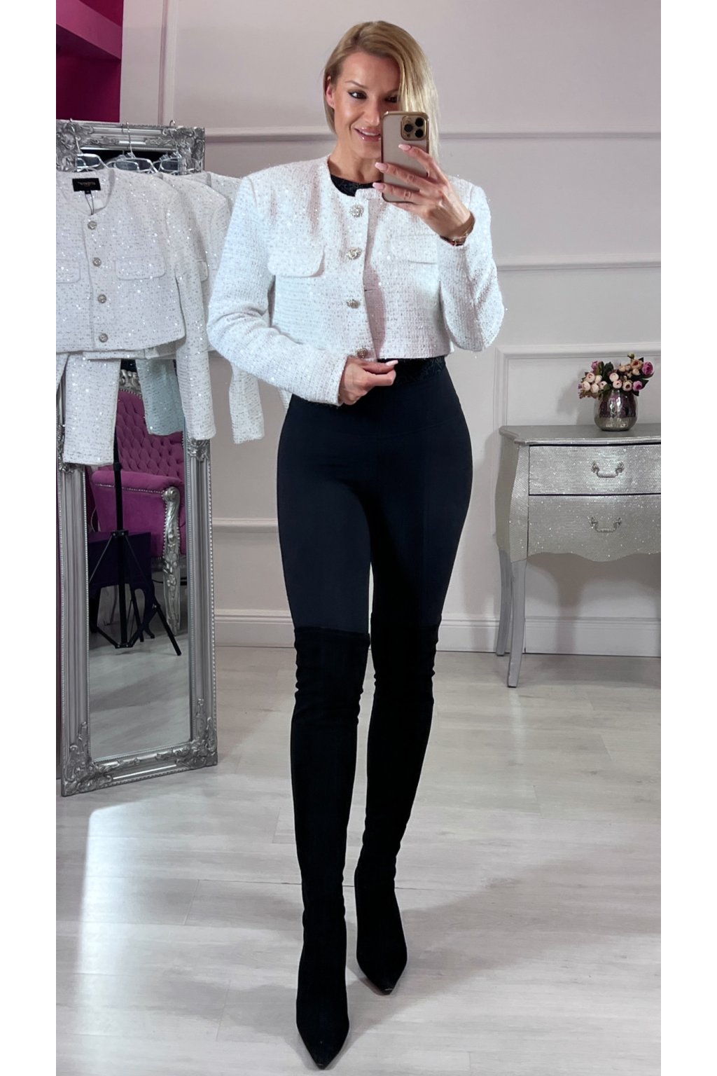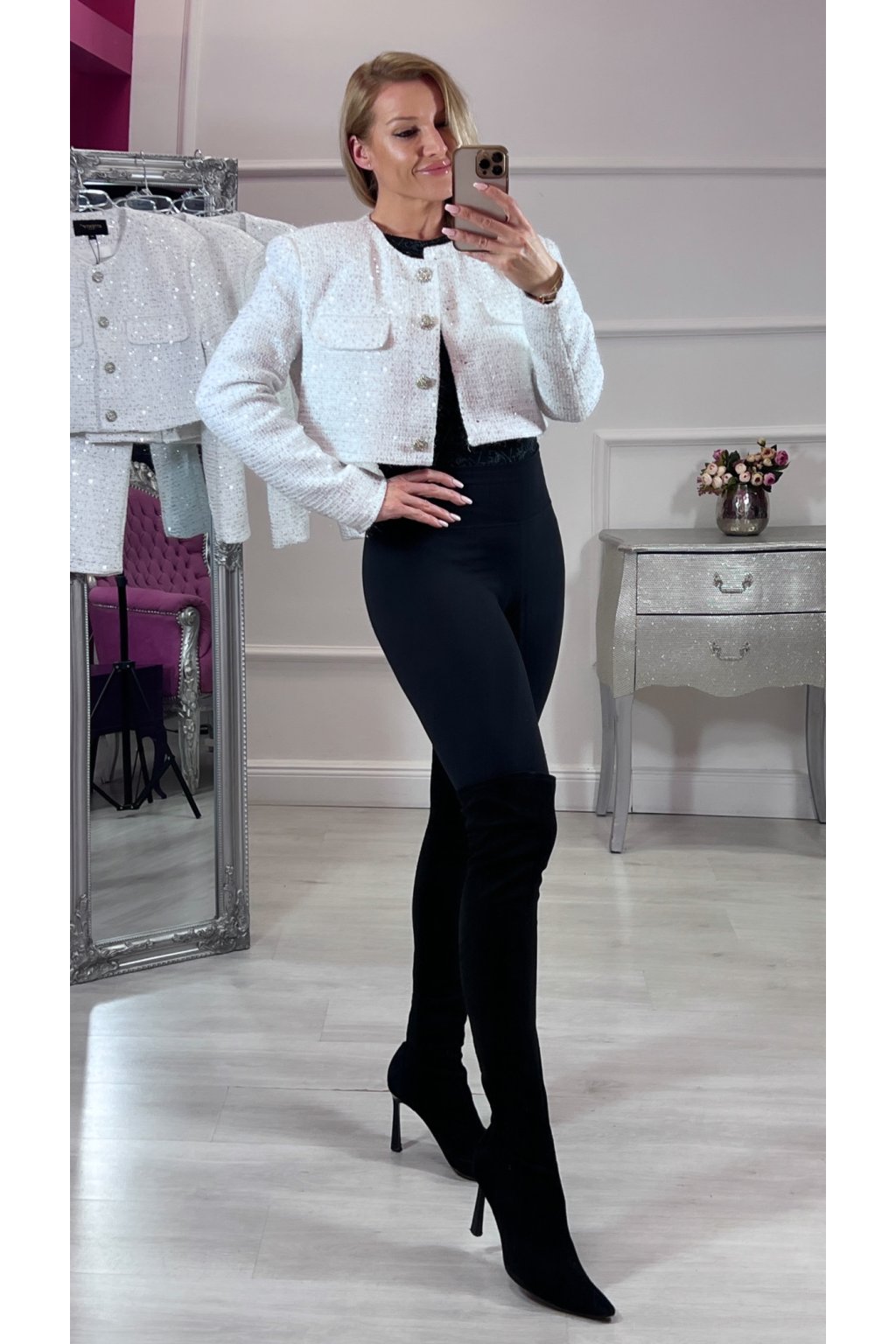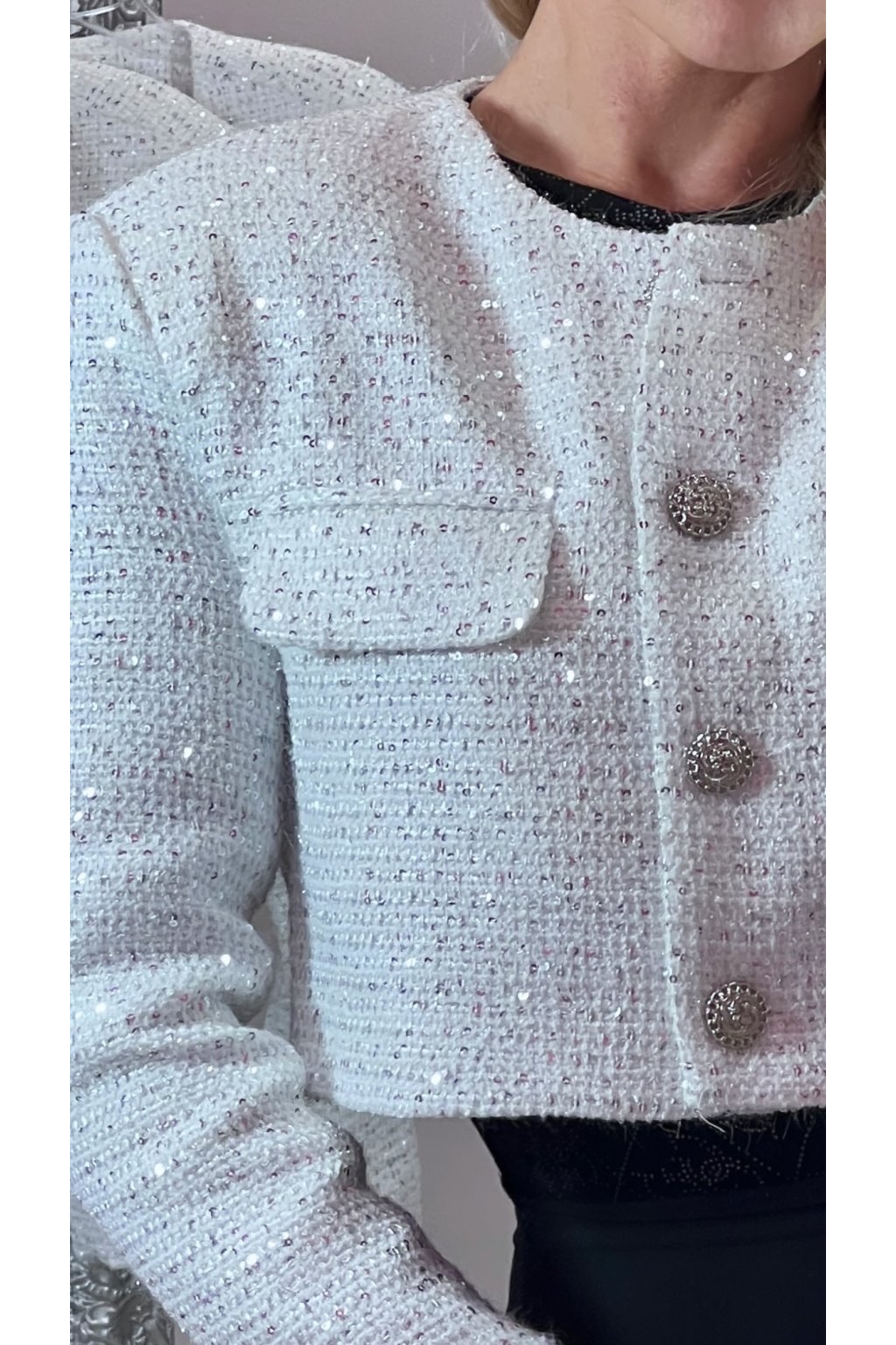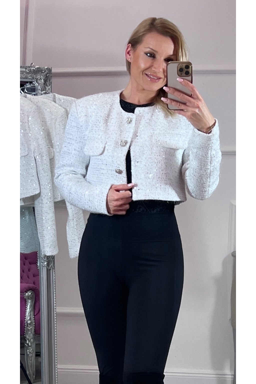 Elegantný krátky blazer z jemnej buklé tkaniny s decentným trblietavým efektom. Má okrúhly výstrih bez goliera, dlhé rukávy a výrazné ozdobné gombíky v striebornej farbe zdobené kamienkami. Prednú časť dopĺňajú imitácie náprsných vreciek s klopou. Perfektne sa hodí k šatám, sukni aj nohaviciam – ideálny kúsok na spoločenské udalosti aj štýlové každodenné nosenie.