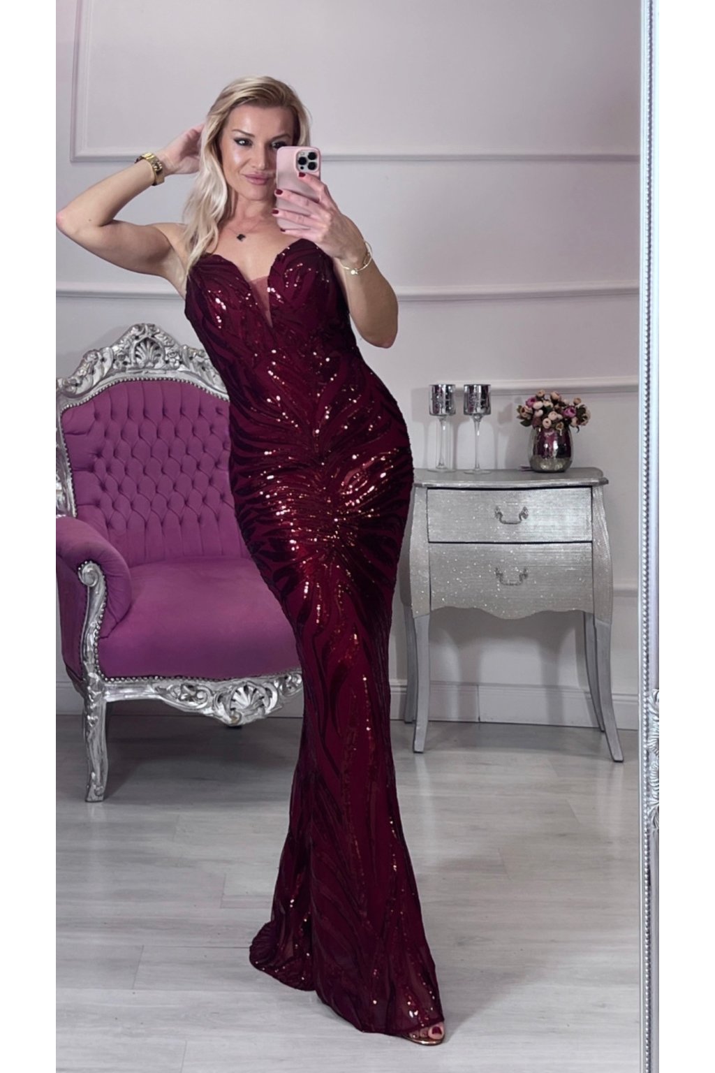 Elegantné vínovo-bordové priliehavé šaty bohato zdobené flitrami, ktoré krásne zvýraznia siluetu. Tenké nastaviteľné ramienka a jemná výstuž zabezpečujú pohodlie aj dokonalé prispôsobenie, pričom šaty je možné nosiť aj s podprsenkou. Zapínanie na zips vzadu dodáva čistý vzhľad. Rafinovaný a ženský model, ktorý pôsobí luxusne a neprehliadnuteľne – presne ten typ šiat, v ktorých zažiarite.