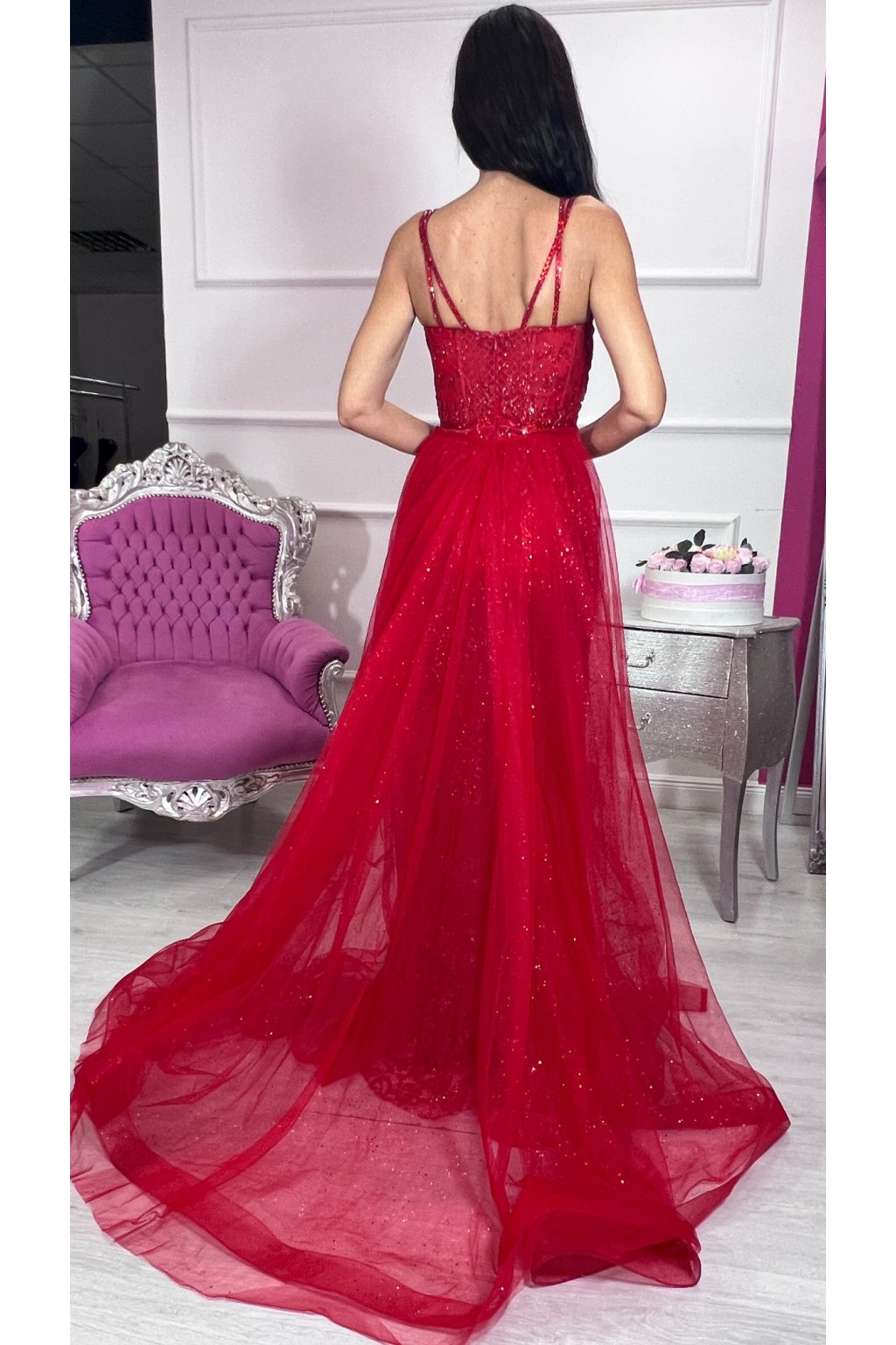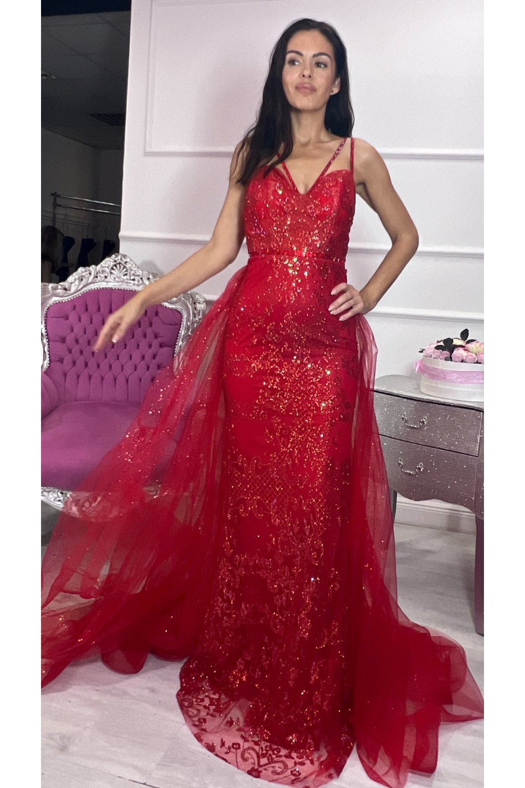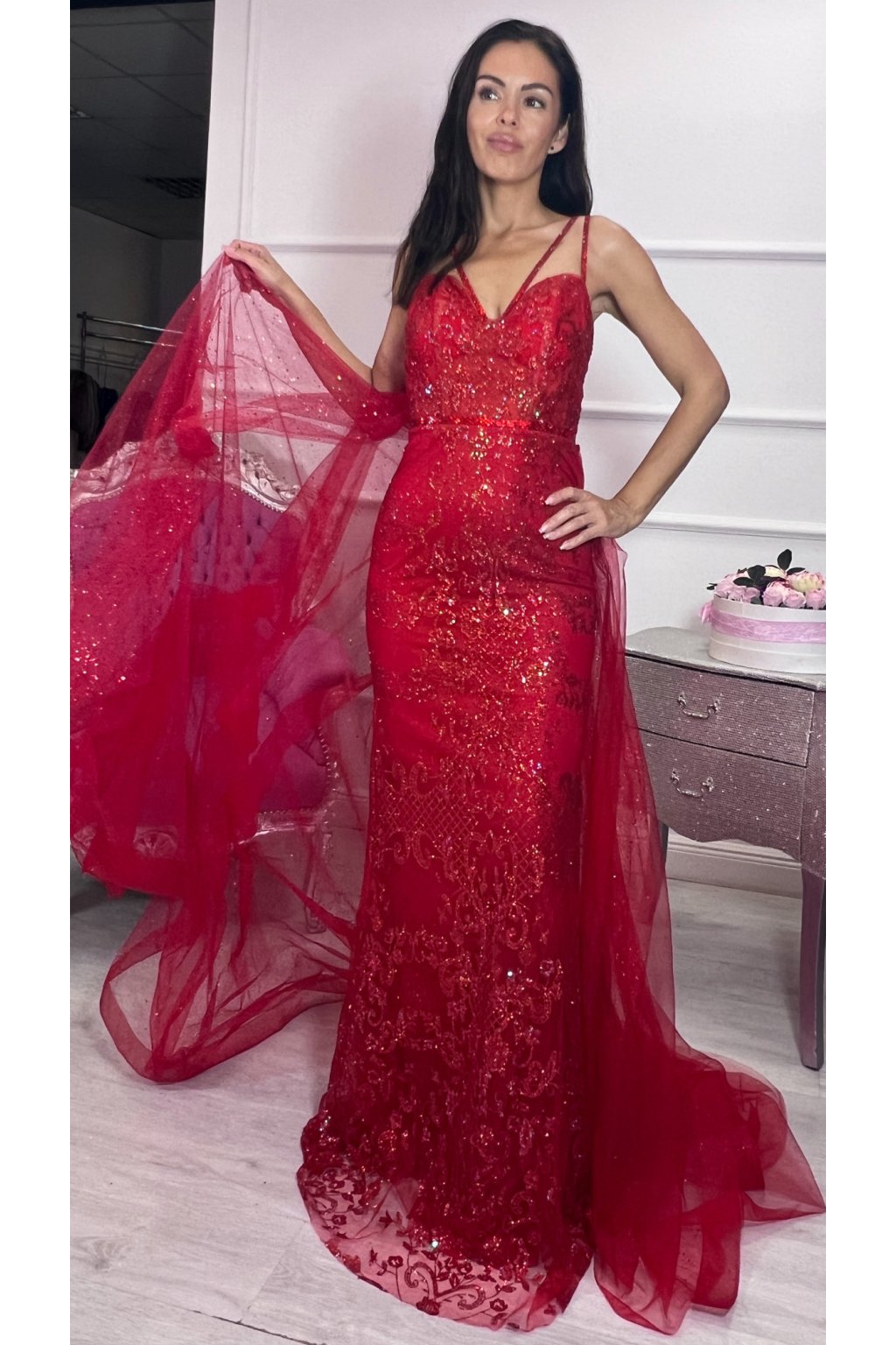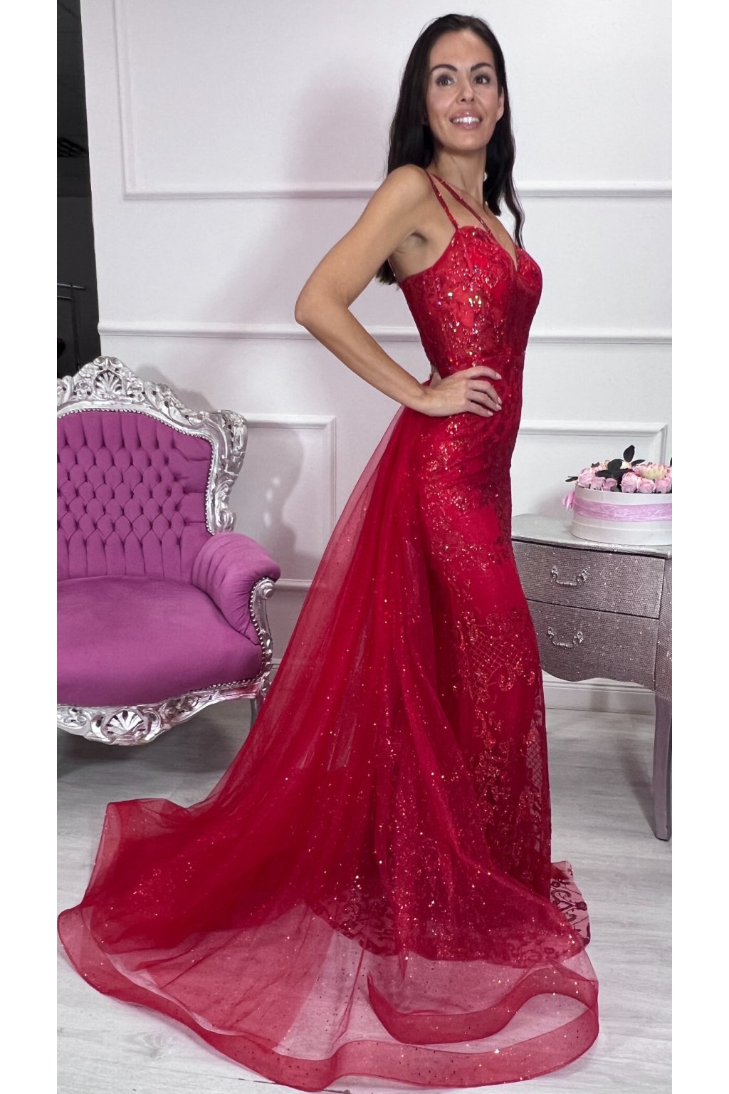 Žiarivo červené, priliehavé čipkované šaty, ktoré dokonale zvýraznia postavu a dýchajú eleganciou. Ich špeciálnym prvkom je odopínateľná tylová sukňa – vďaka nej pôsobia raz zvodne, raz honosne, akoby šité na dve príležitosti v jednom. Celý povrch šiat sa jemne trbliece a pri každom kroku zachytáva svetlo, čo im dodáva šmrnc luxusu. Dvojité ramienka zdobené kamienkami pôsobia rafinovane a spoločne s bohatou čipkovanou výzdobou vytvárajú dojem výnimočného modelu. Šaty majú praktické zapínanie vzadu na zips a pevnú výstuž, ktorá zaručuje krásny tvar dekoltu a pohodlné nosenie.