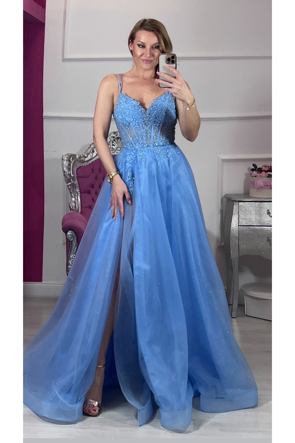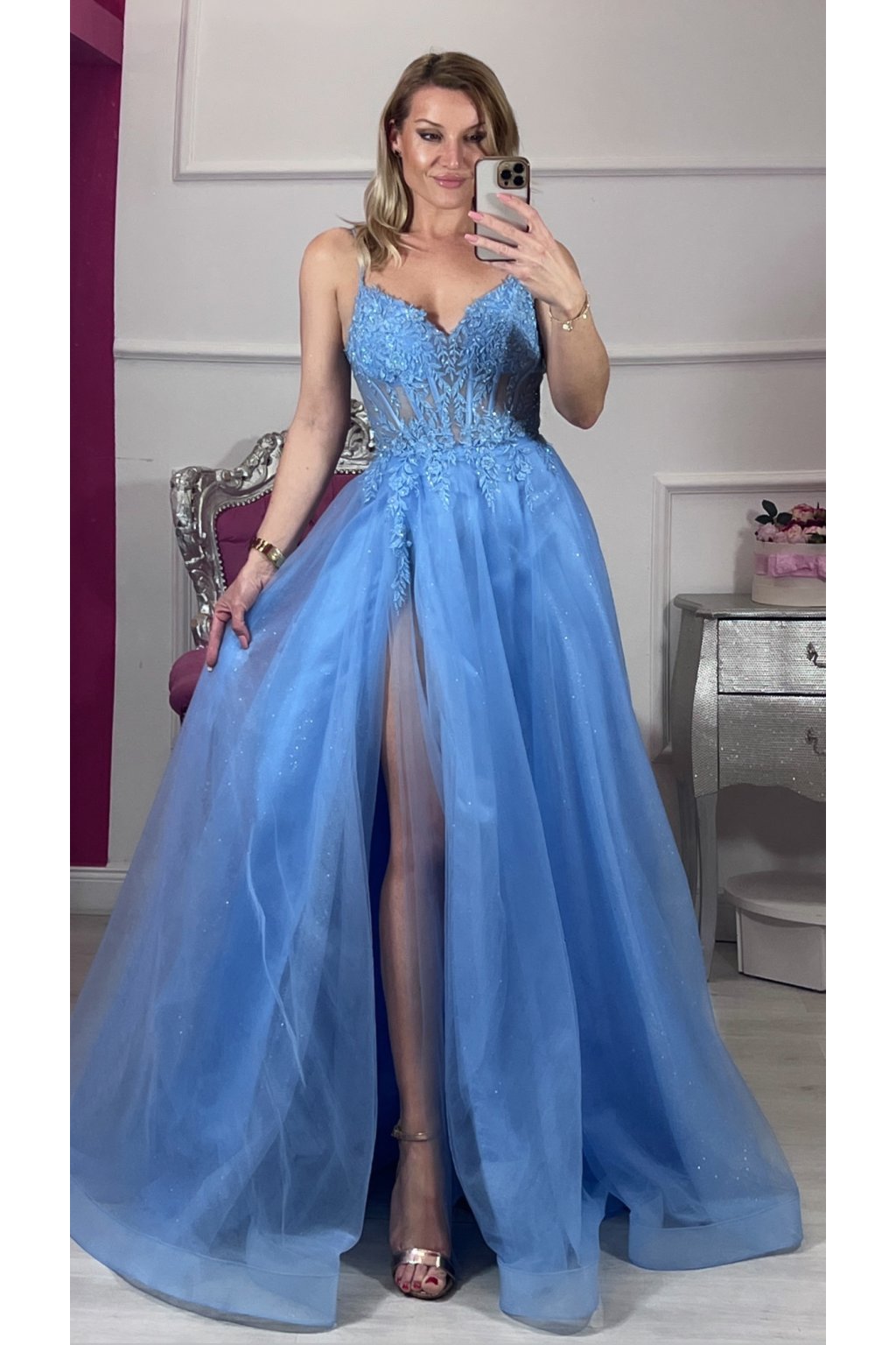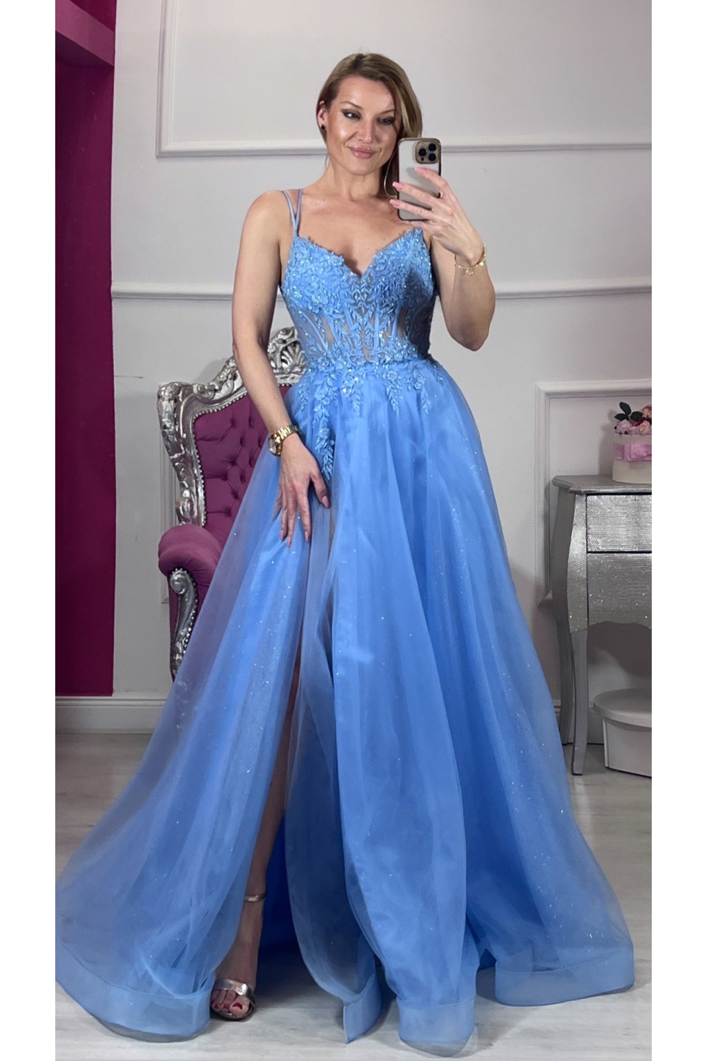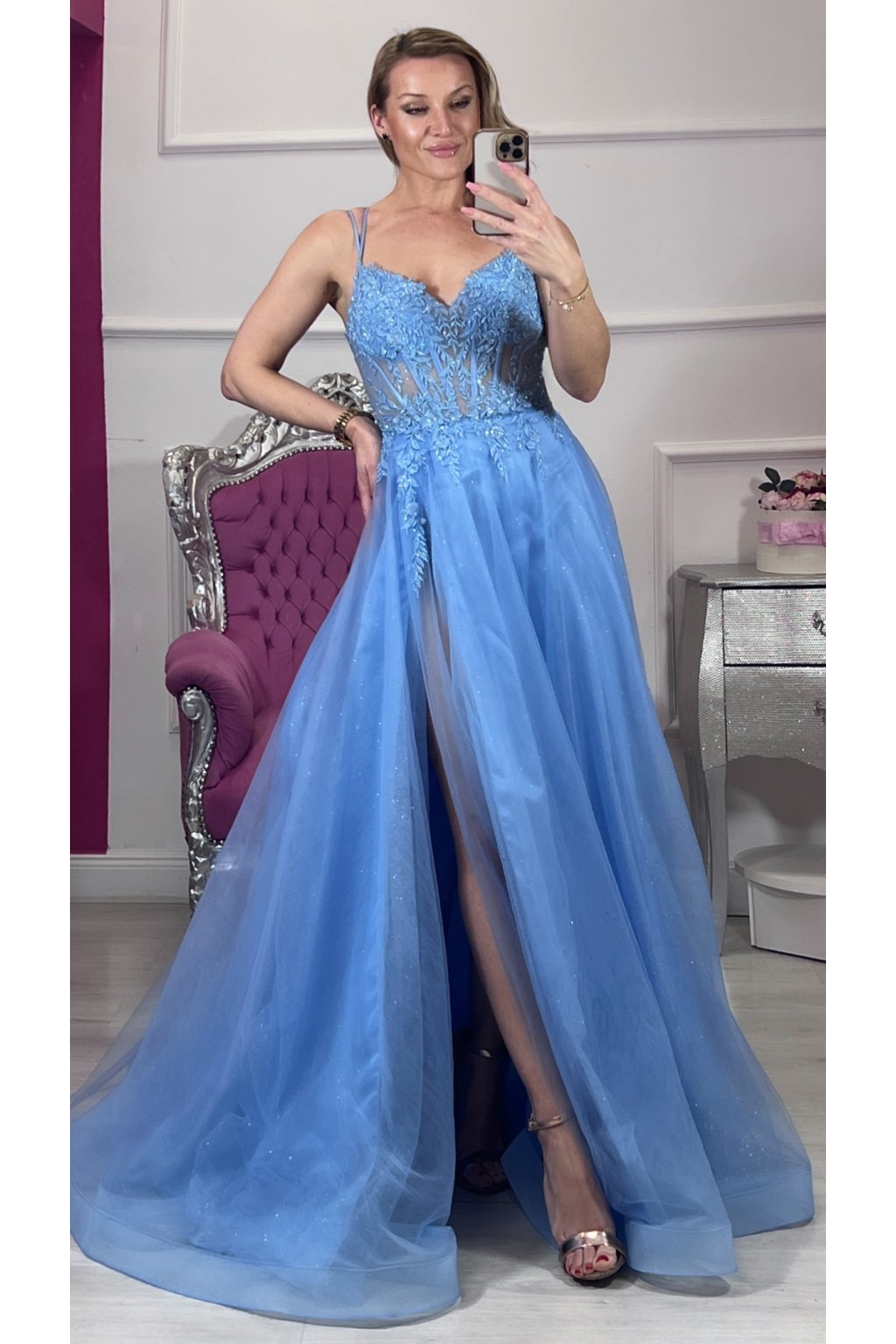 Elegantné spoločenské šaty v romantickej svetlomodrej farbe, ktoré okamžite upútajú pohľad. Jemne vyšívaný korzet s čipkovými aplikáciami krásne zvýrazní postavu, zatiaľ čo ľahká trblietavá tylová sukňa dodáva šatám vzdušnosť a noblesu. Zmyselný rozparok na nohe a šnurovanie na chrbte vytvárajú dokonalú kombináciu elegancie a ženskosti – ideálne na ples, svadbu či výnimočný večer. ✨