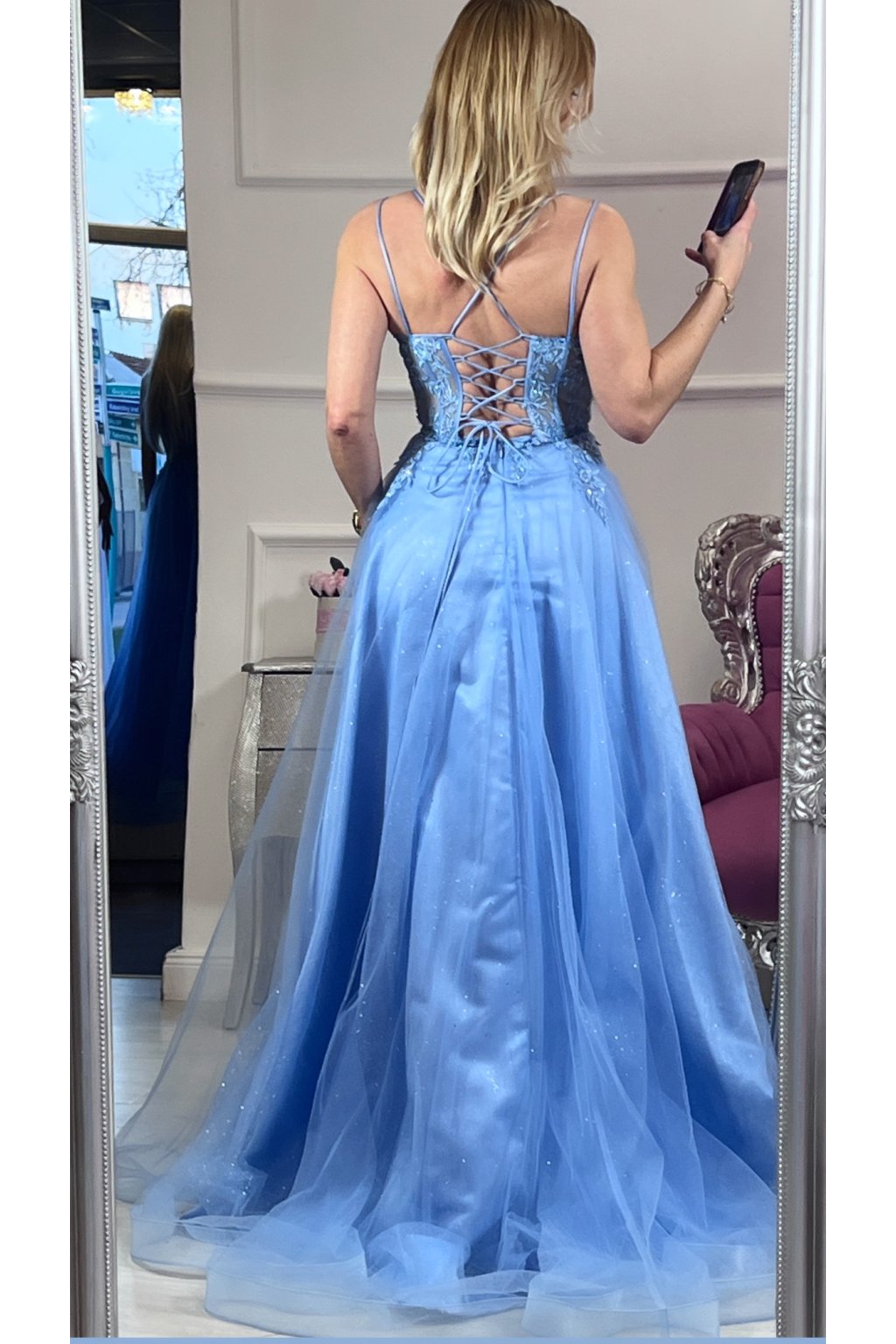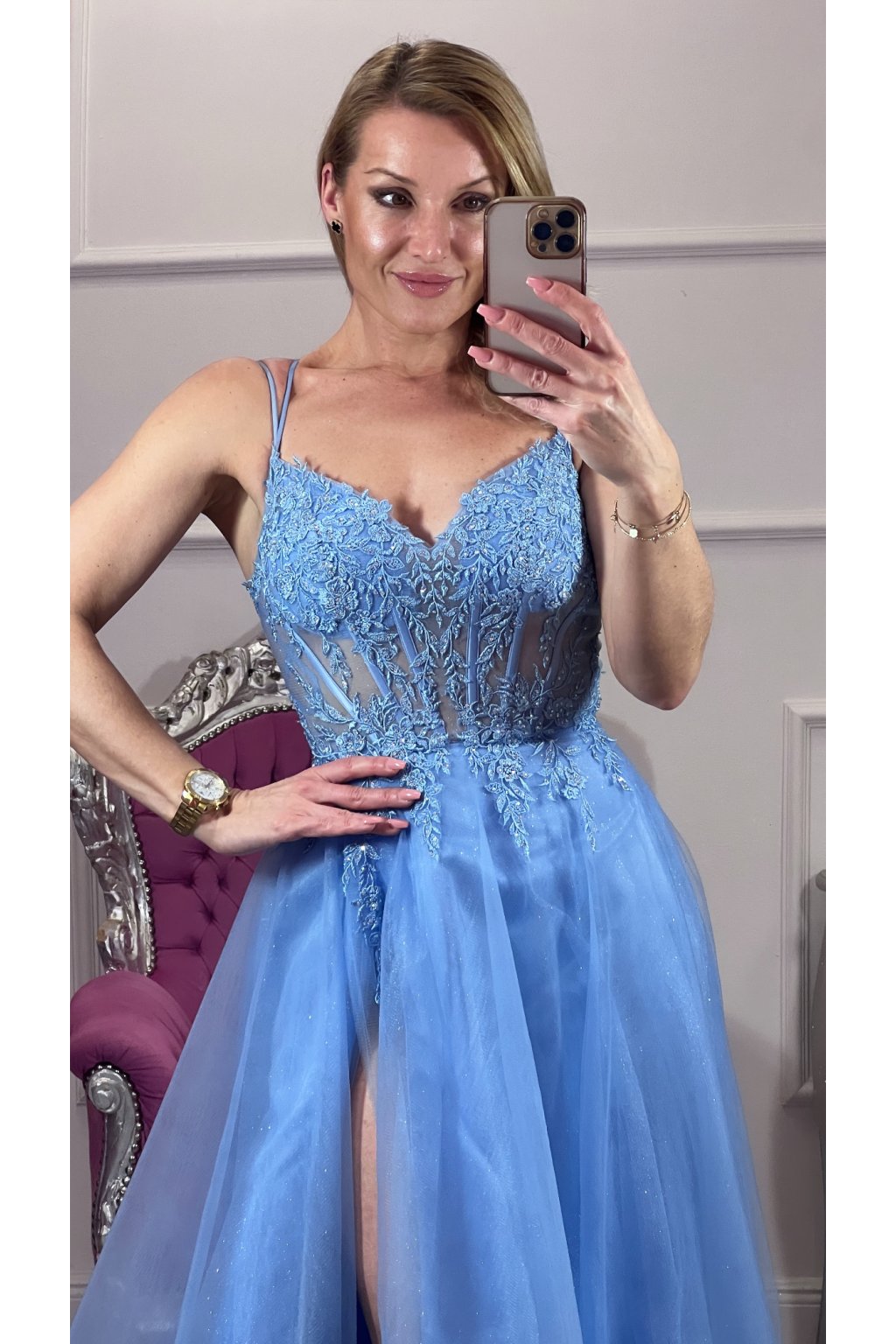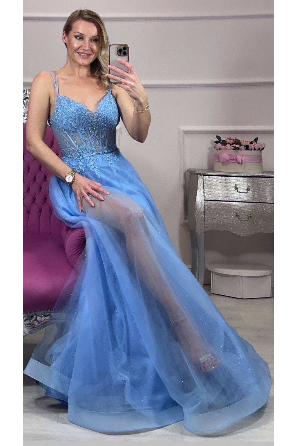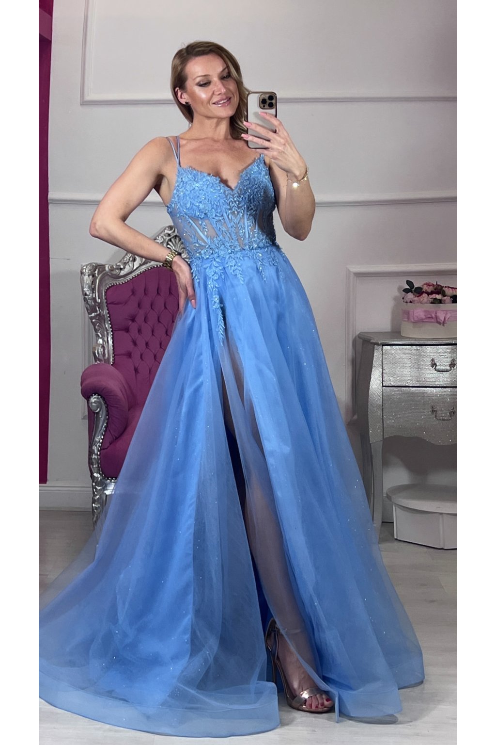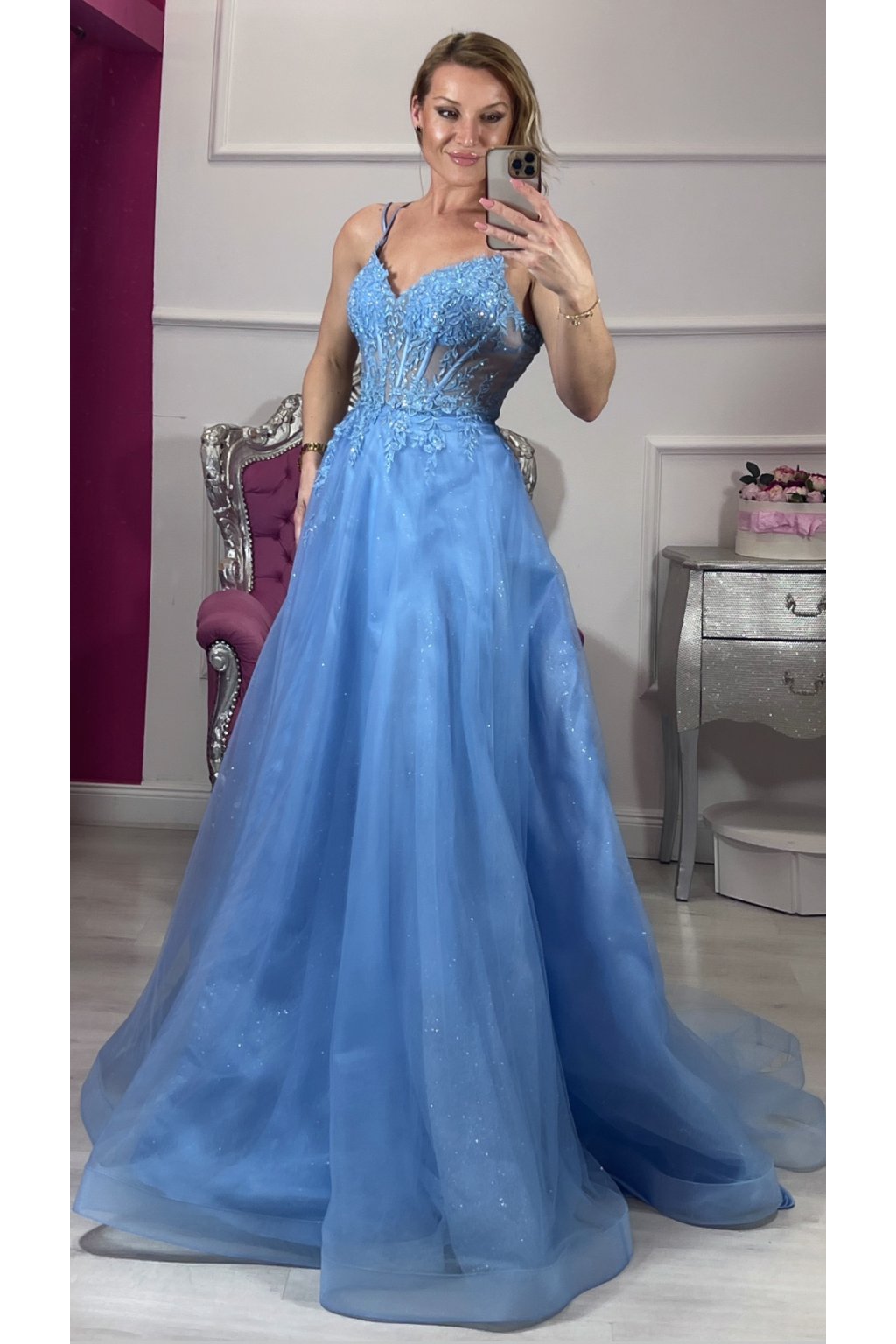 Elegantné spoločenské šaty v romantickej svetlomodrej farbe, ktoré okamžite upútajú pohľad. Jemne vyšívaný korzet s čipkovými aplikáciami krásne zvýrazní postavu, zatiaľ čo ľahká trblietavá tylová sukňa dodáva šatám vzdušnosť a noblesu. Zmyselný rozparok na nohe a šnurovanie na chrbte vytvárajú dokonalú kombináciu elegancie a ženskosti – ideálne na ples, svadbu či výnimočný večer. ✨