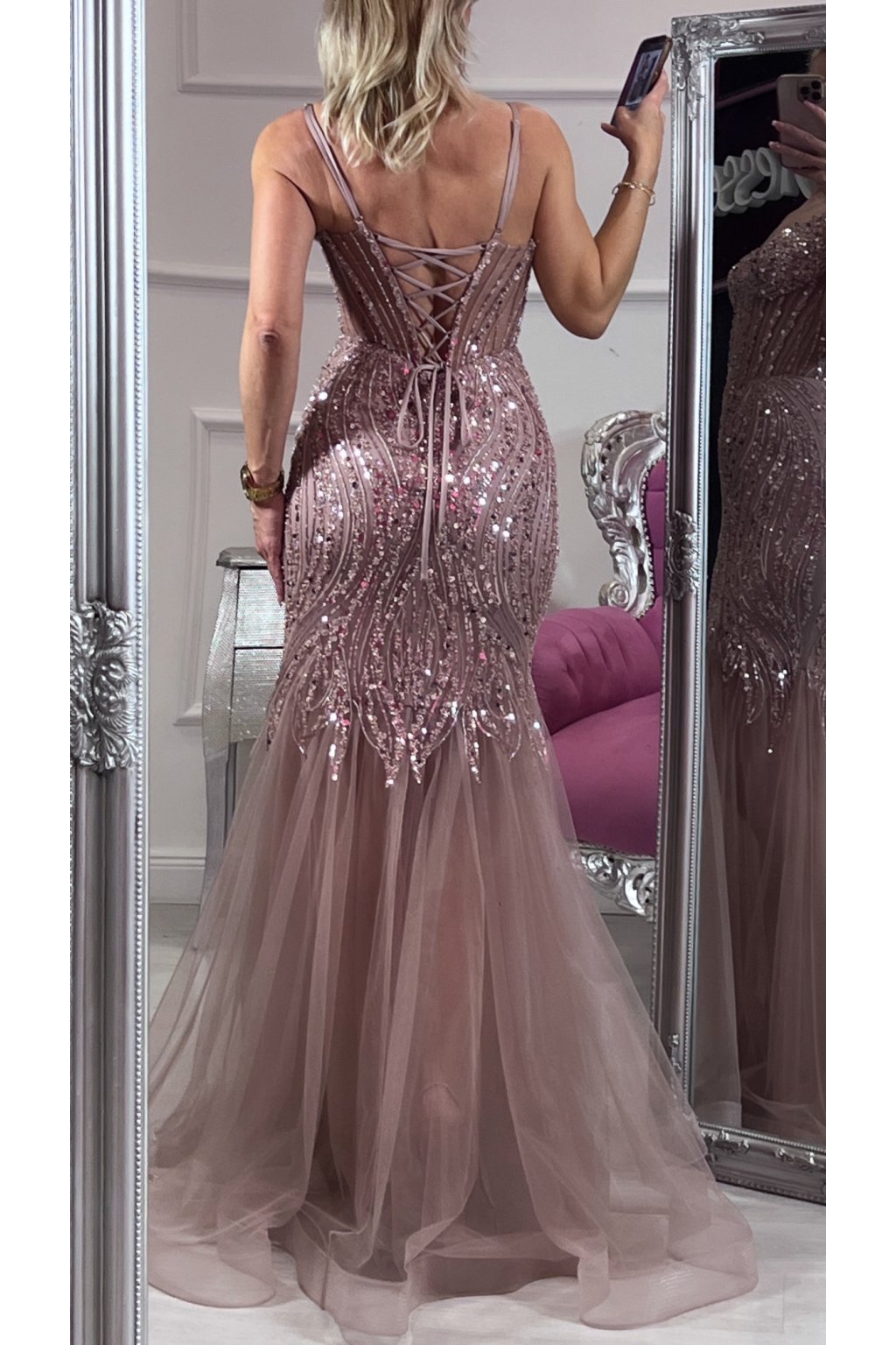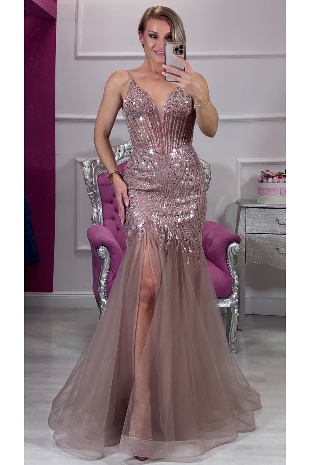 Telo šiat je bohato zdobené flitrami a prepracovanými korálikmi, ktoré vytvárajú žiarivý efekt pri každom kroku. Kvalitné šitie zabezpečuje, že žiadne ozdoby nepadnú, a vstavaná výstuž dokonale tvaruje dekolt. Jemné tenké ramienka pôsobia elegantne, zatiaľ čo ľahko priesvitný korzet s rafinovanými detailmi dodáva celkovému dizajnu exkluzívny charakter.