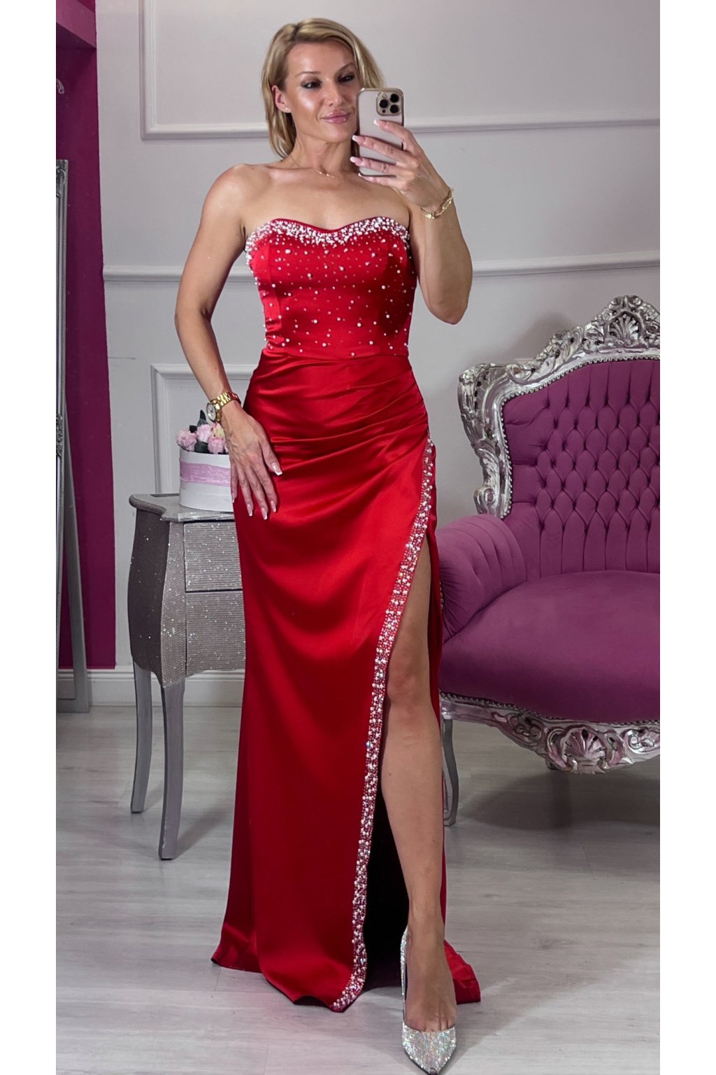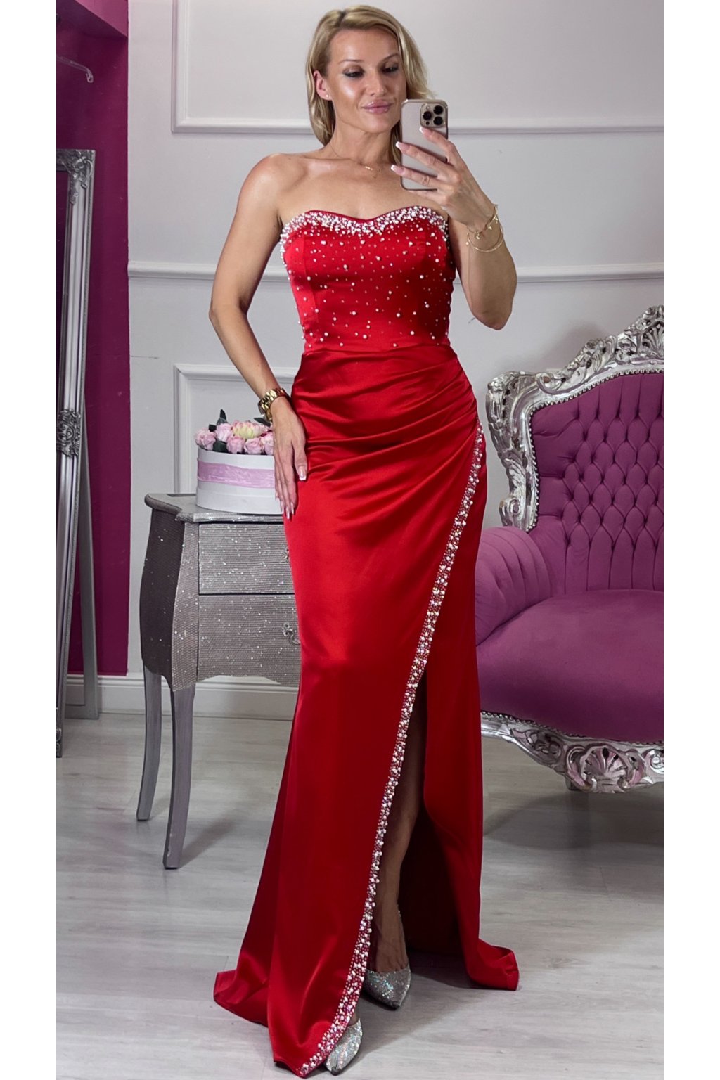 Dlhé spoločenské šaty s perlami a kamienkami - červené