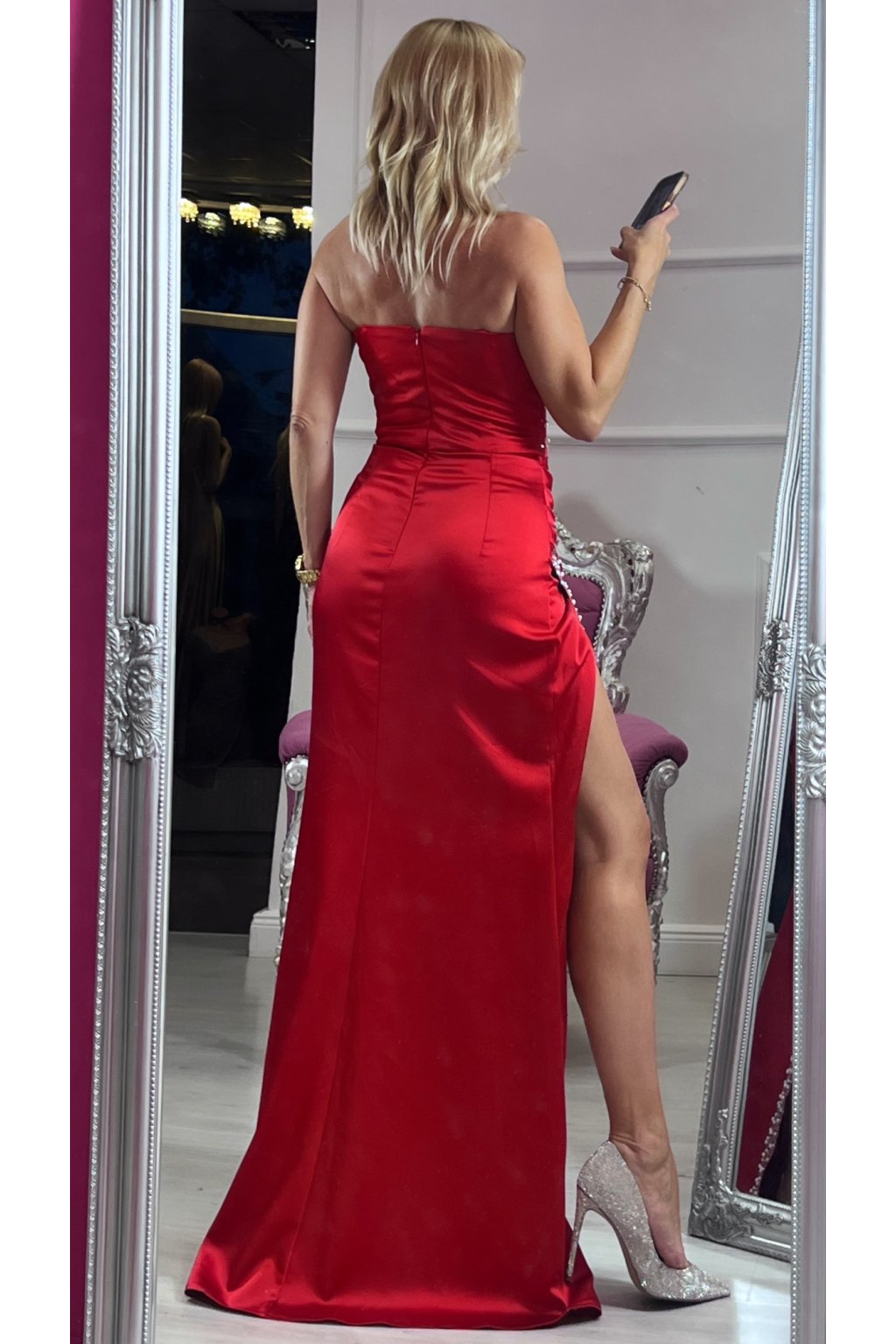 Dlhé priliehavé šaty s rozparkom, zdobené kamienkami a perlami. Elegantný korzet s výstužou dokonale drží, nepadajú ani pri pohybe, a zapínanie na zips vzadu zaisťuje pohodlie aj istotu. 💎👗