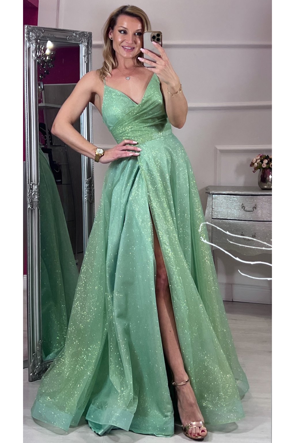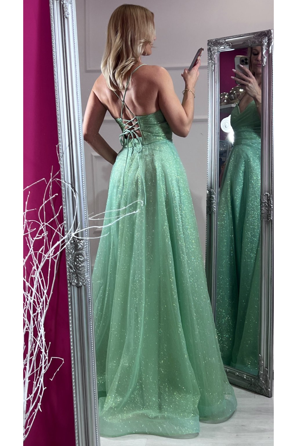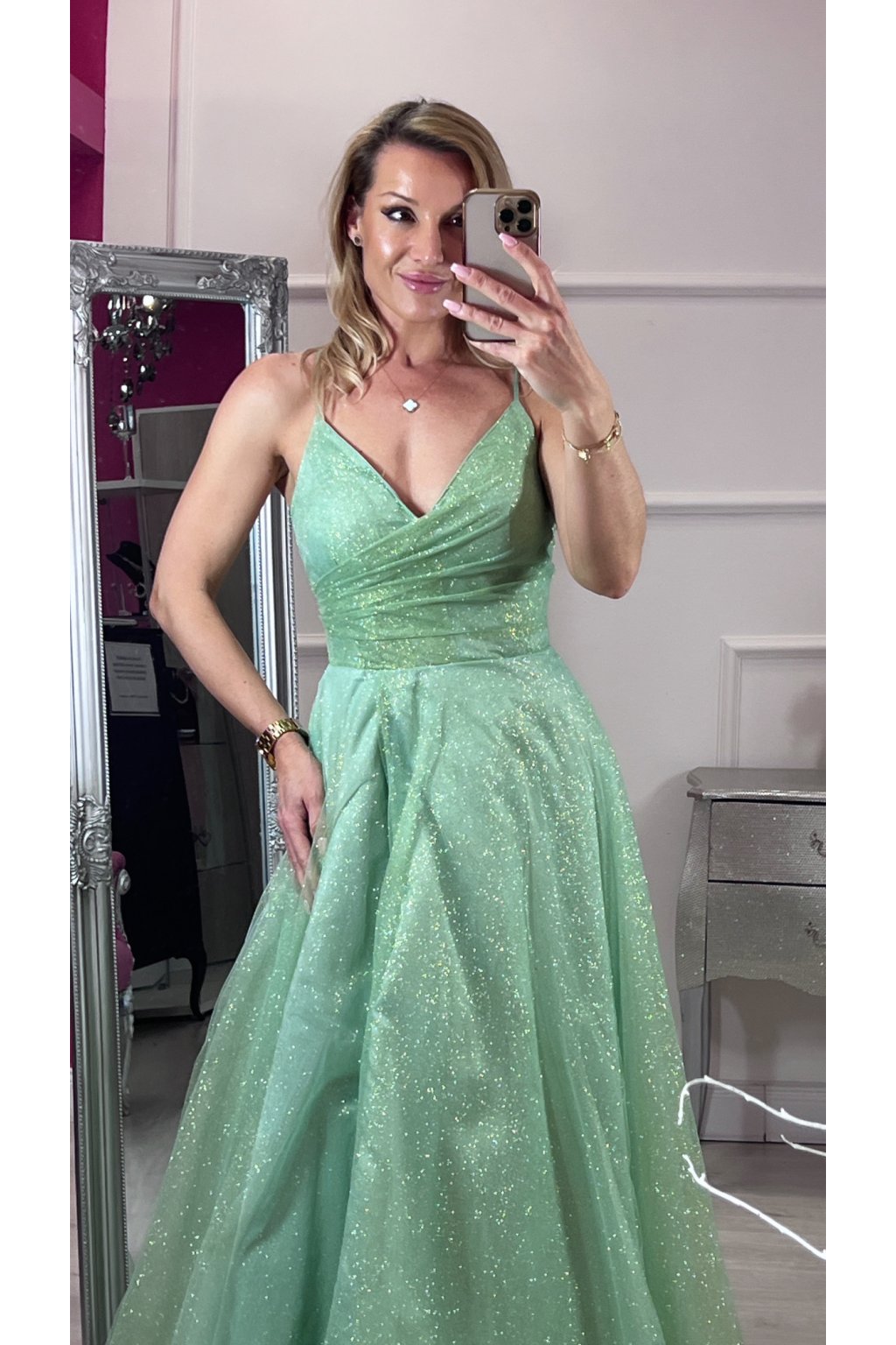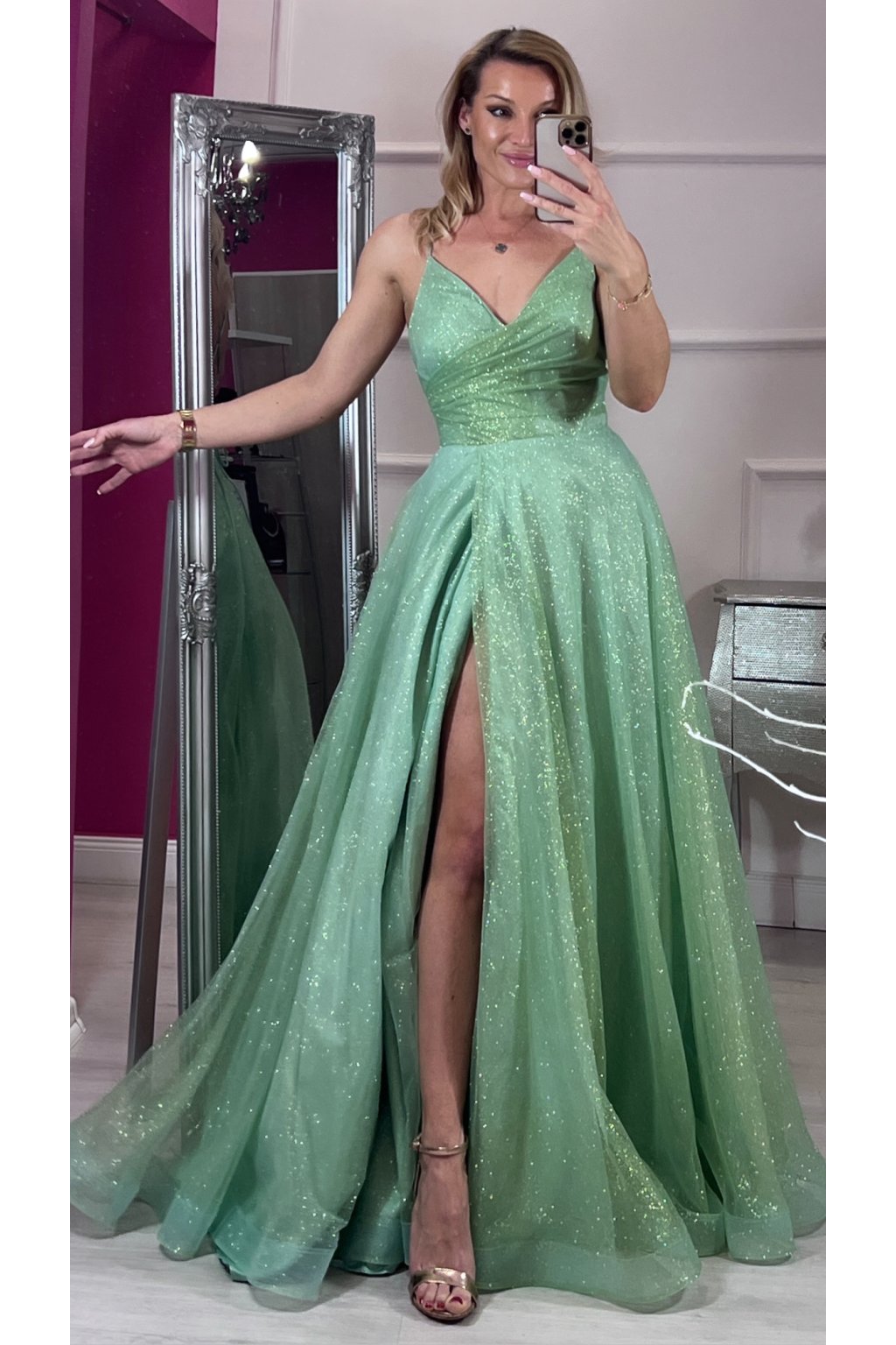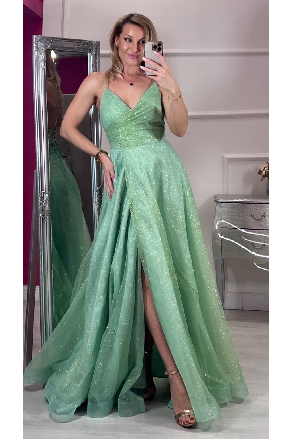 Tieto elegantné zelené šaty zaujmú na prvý pohľad svojím princeznovským strihom a jemne trblietavou látkou. Sukňa s ľahkým leskom krásne padá a dodáva šatám rozprávkový vzhľad. Vzadu sú na šnurovačku, vďaka ktorej sa dokonale prispôsobia postave a zvýraznia pás. Ideálna voľba na stužkovú, ples či inú slávnostnú príležitosť.