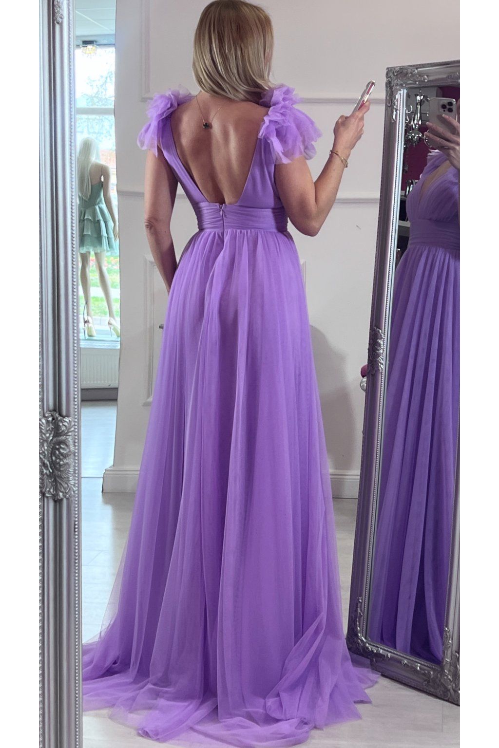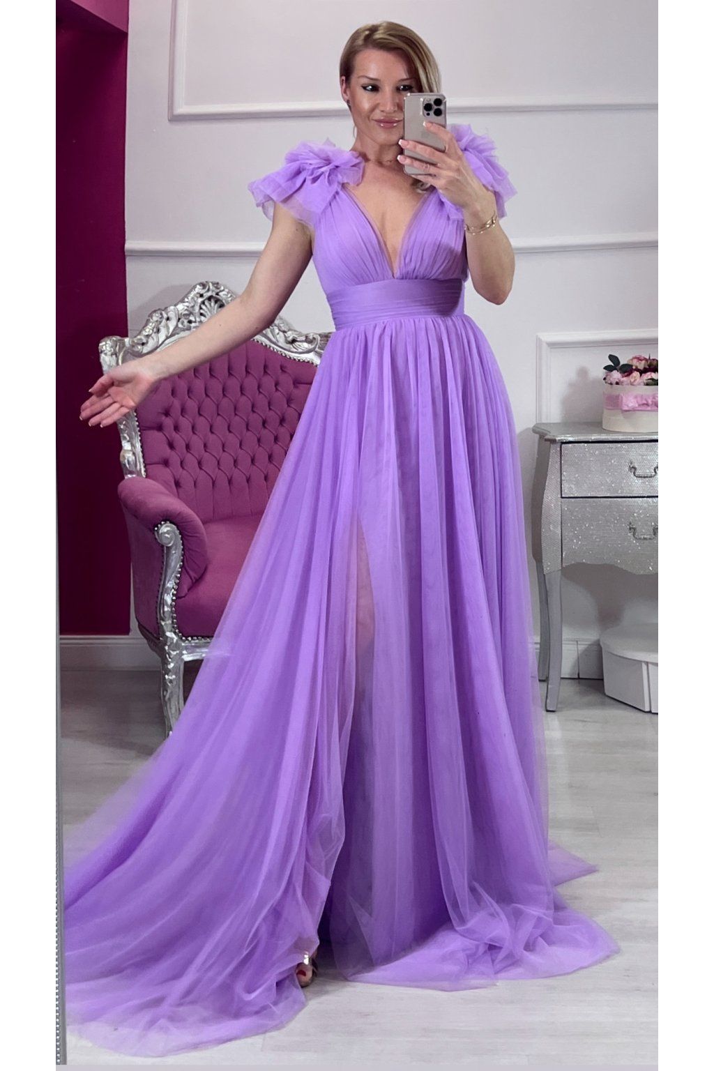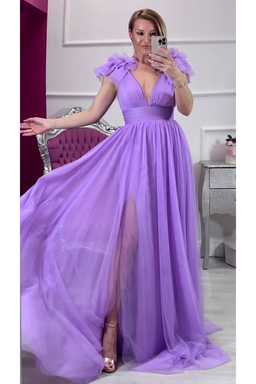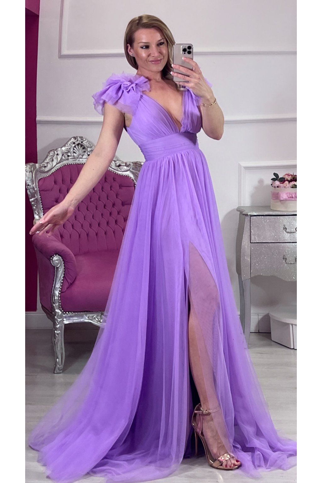 Elegantné spoločenské šaty v jemnom fialovom odtieni, ktoré pôsobia romanticky a zároveň luxusne. Model má dlhú, vzdušnú tylovú sukňu s vysokým rozparkom, ktorý zvýrazňuje nohy a dodáva šatám ženský šmrnc.
