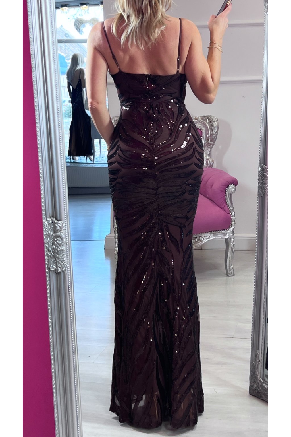 Elegantné hnedé priliehavé šaty bohato zdobené flitrami, ktoré krásne zvýraznia siluetu. Tenké nastaviteľné ramienka a jemná výstuž zabezpečujú pohodlie aj dokonalé prispôsobenie, pričom šaty je možné nosiť aj s podprsenkou. Zapínanie na zips vzadu dodáva čistý vzhľad. Rafinovaný a ženský model, ktorý pôsobí luxusne a neprehliadnuteľne – presne ten typ šiat, v ktorých zažiarite.