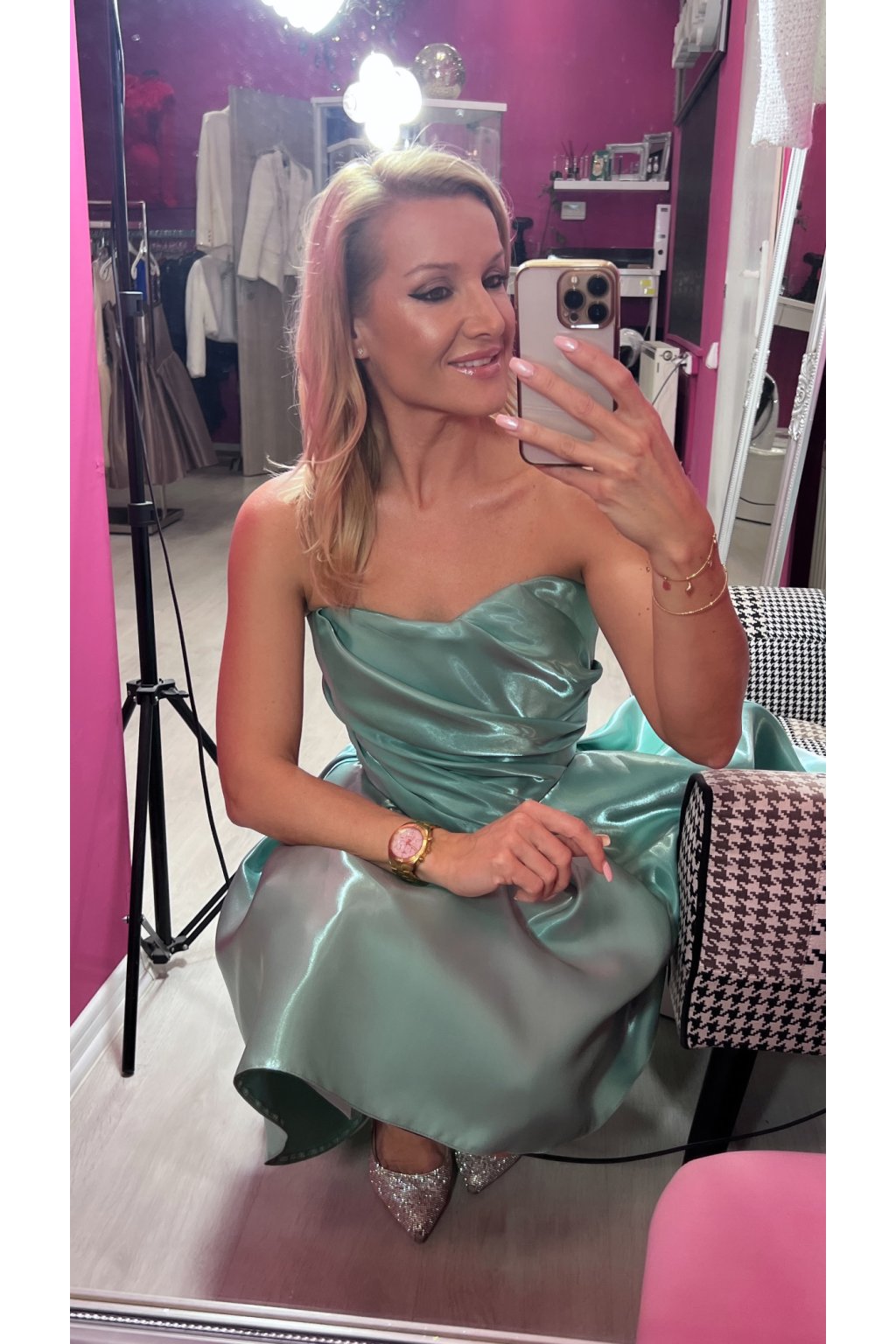 Sukňa je jemne vlnitá a dodáva modelu pohyb. Vzadu sa šaty zapínajú na zips. Látka je pevnejšia, nádherne lesklá a vytvára luxusný „wow“ efekt na prvý pohľad. ✨
