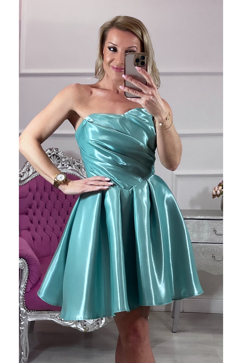 Krátke šaty nad kolená v áčkovom strihu, ktoré krásne tvarujú postavu a zvýraznia pás. Vrchná pevná korzetová časť je so sukňou prešitá do výrazného V-čkovitého tvaru, čo vytvára jemný princeznovský efekt a pôsobí veľmi žensky a elegantne.