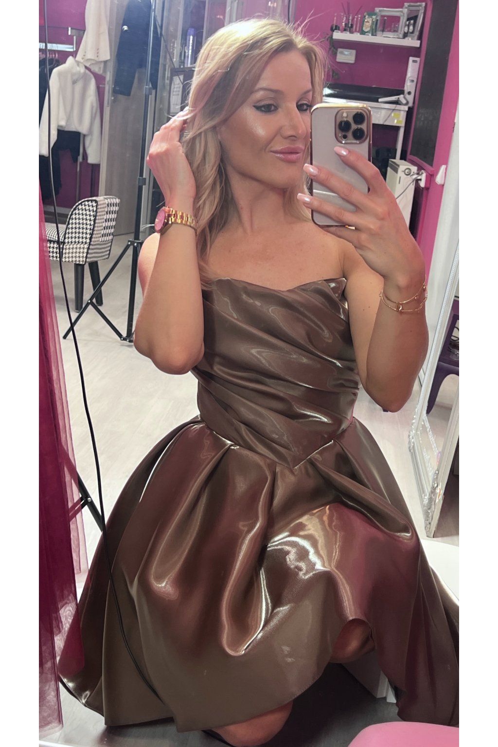 Sukňa je jemne vlnitá a dodáva modelu pohyb. Vzadu sa šaty zapínajú na zips. Látka je pevnejšia, nádherne lesklá a vytvára luxusný „wow“ efekt na prvý pohľad. ✨