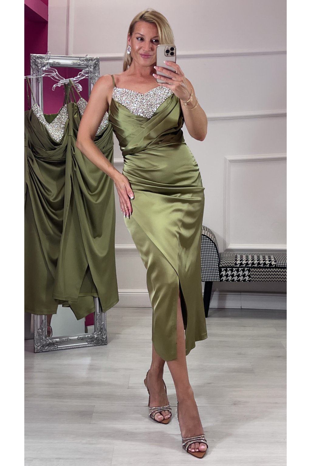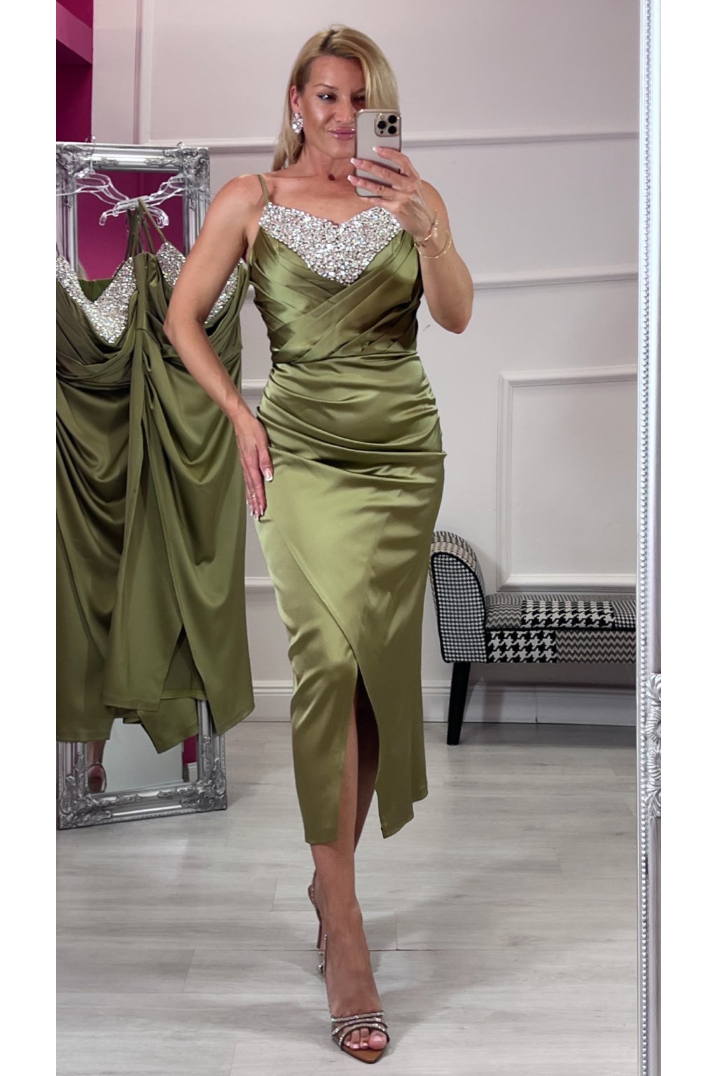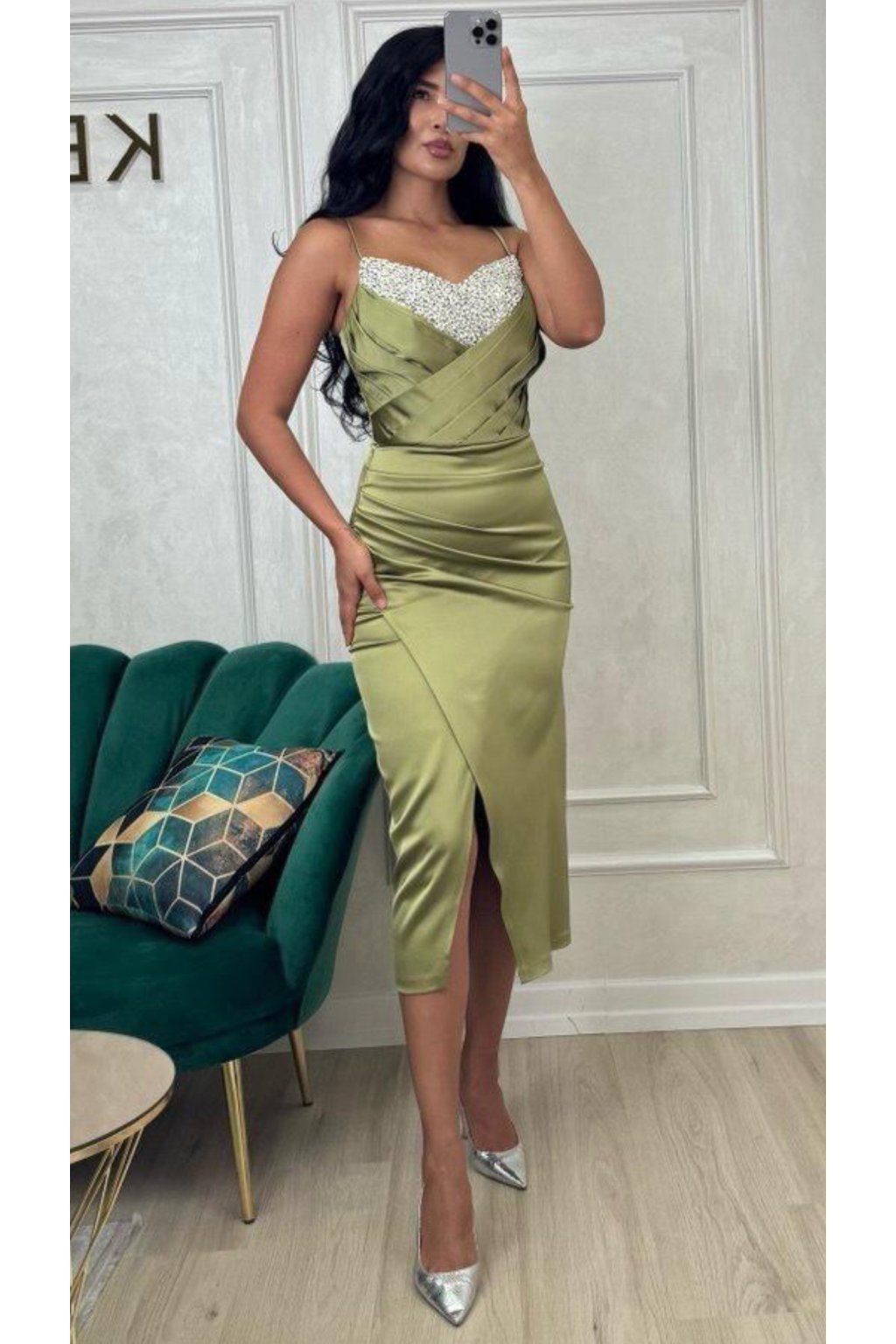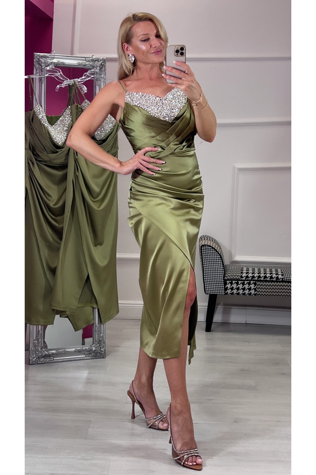 Tieto úzke, lichotivé šaty zaujmú svojím rafinovaným strihom, ktorý jemne tvaruje postavu a zároveň decentne zakrýva bruško vďaka elegantným, prekrývajúcim sa lamelám. Lamelová úprava sa opakuje aj v oblasti dekoltu, kde je zdobená jemne sa trblietajúcimi kamienkami. Všitá tvarovaná podprsenka s decentným rozparkom dodáva šatám dokonalý tvar a pohodlie. Šaty sú ušité v pôvabnom eukalyptovom odtieni, zapínajú sa na skrytý zips a majú nastaviteľné ramienka pre ideálne prispôsobenie.