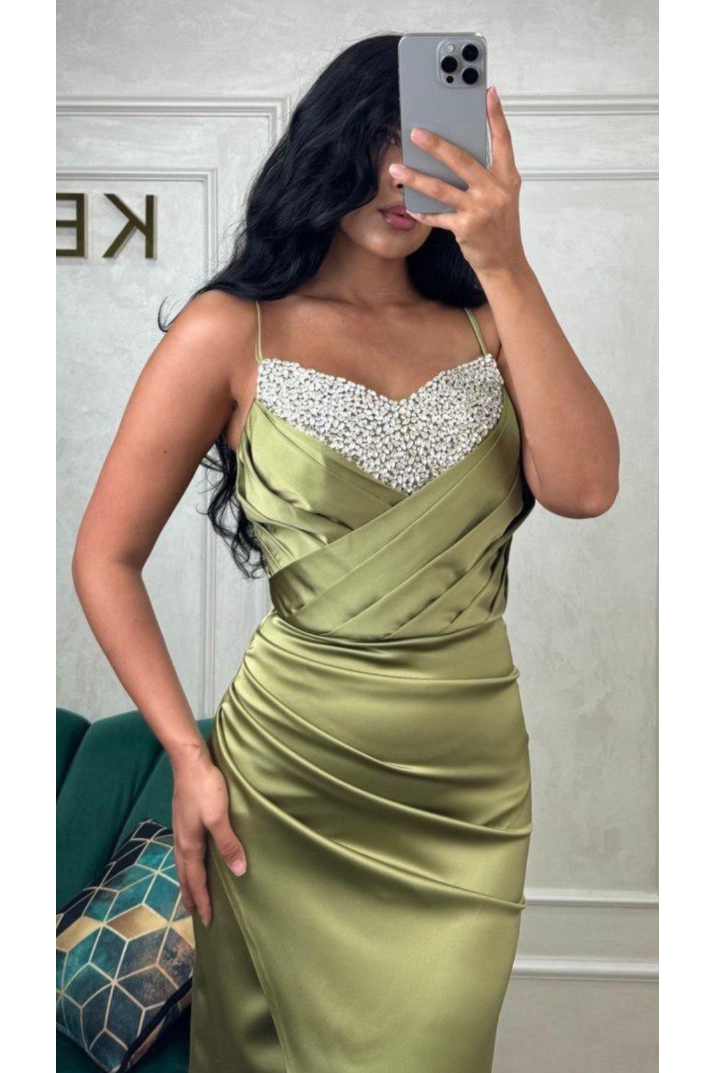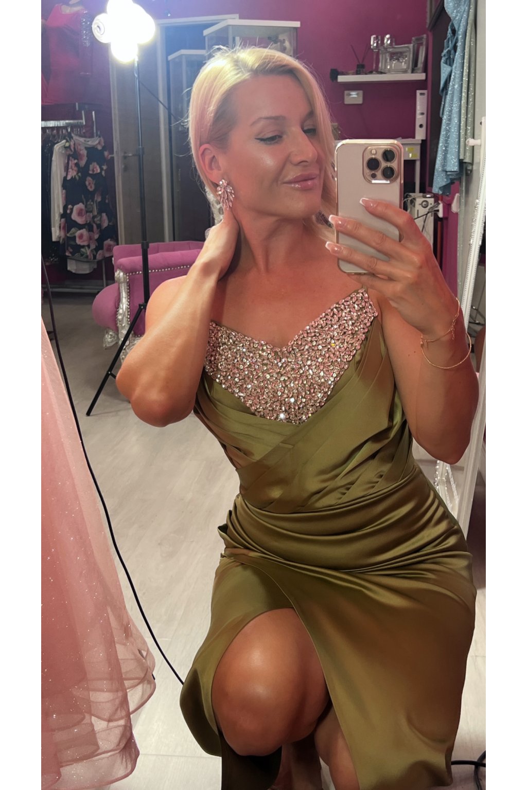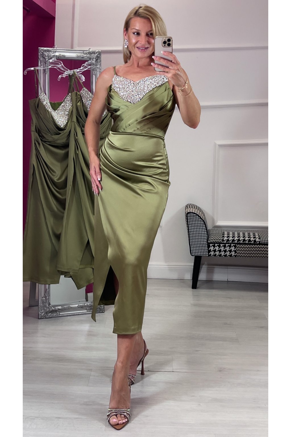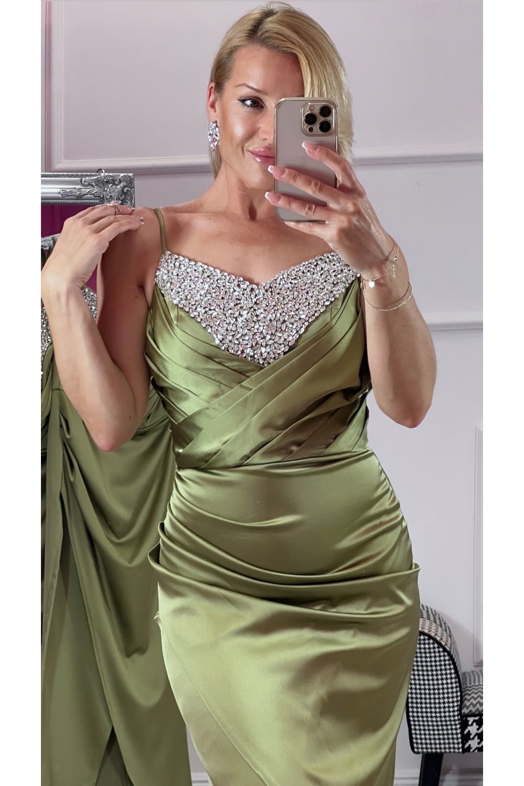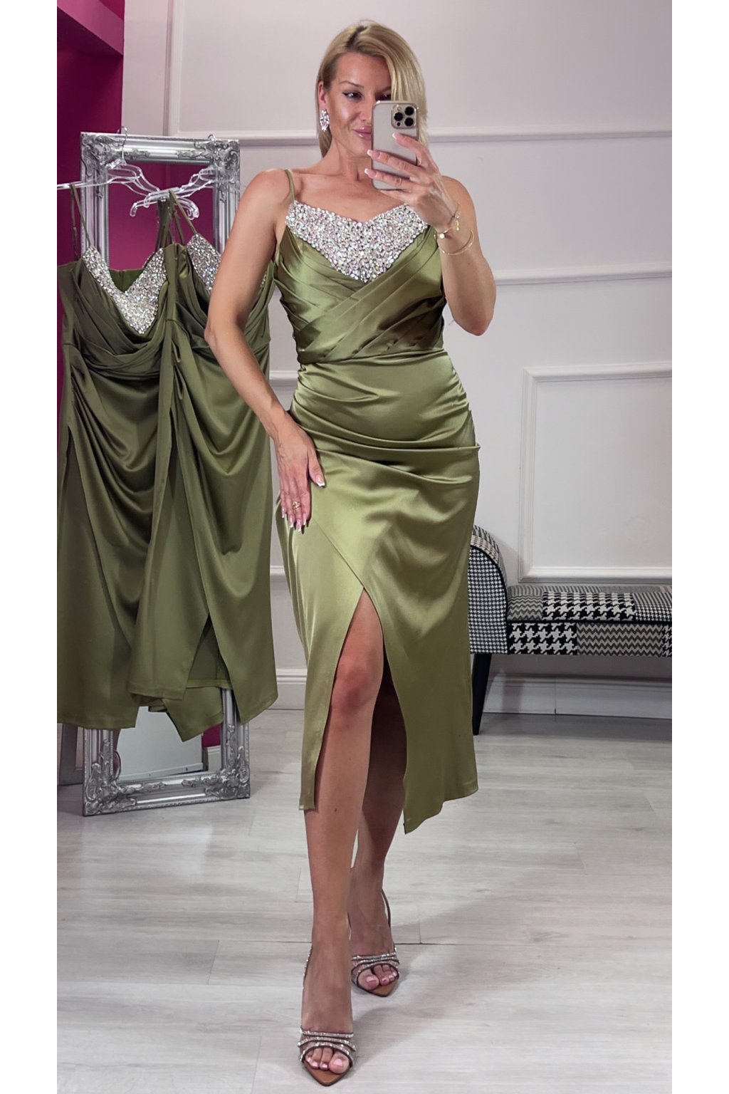 Tieto úzke, lichotivé šaty zaujmú svojím rafinovaným strihom, ktorý jemne tvaruje postavu a zároveň decentne zakrýva bruško vďaka elegantným, prekrývajúcim sa lamelám. Lamelová úprava sa opakuje aj v oblasti dekoltu, kde je zdobená jemne sa trblietajúcimi kamienkami. Všitá tvarovaná podprsenka s decentným rozparkom dodáva šatám dokonalý tvar a pohodlie. Šaty sú ušité v pôvabnom eukalyptovom odtieni, zapínajú sa na skrytý zips a majú nastaviteľné ramienka pre ideálne prispôsobenie.