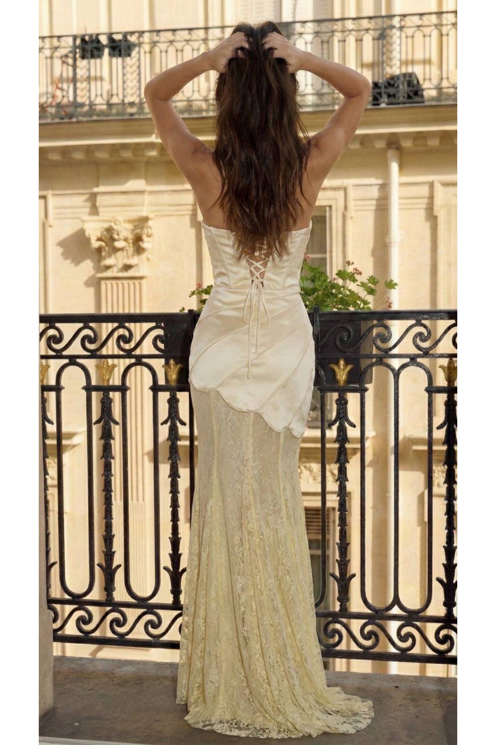 Krémové korzetové šaty bez ramienok s jemne tvarovaným výstrihom, ktoré nádherne zvýraznia ženskú siluetu ✨ Hladký saténový vrch sa plynulo prelína s bohato čipkovanou maxi sukňou a vytvára jedinečný, netradičný kontrast plný elegancie a šarmu.