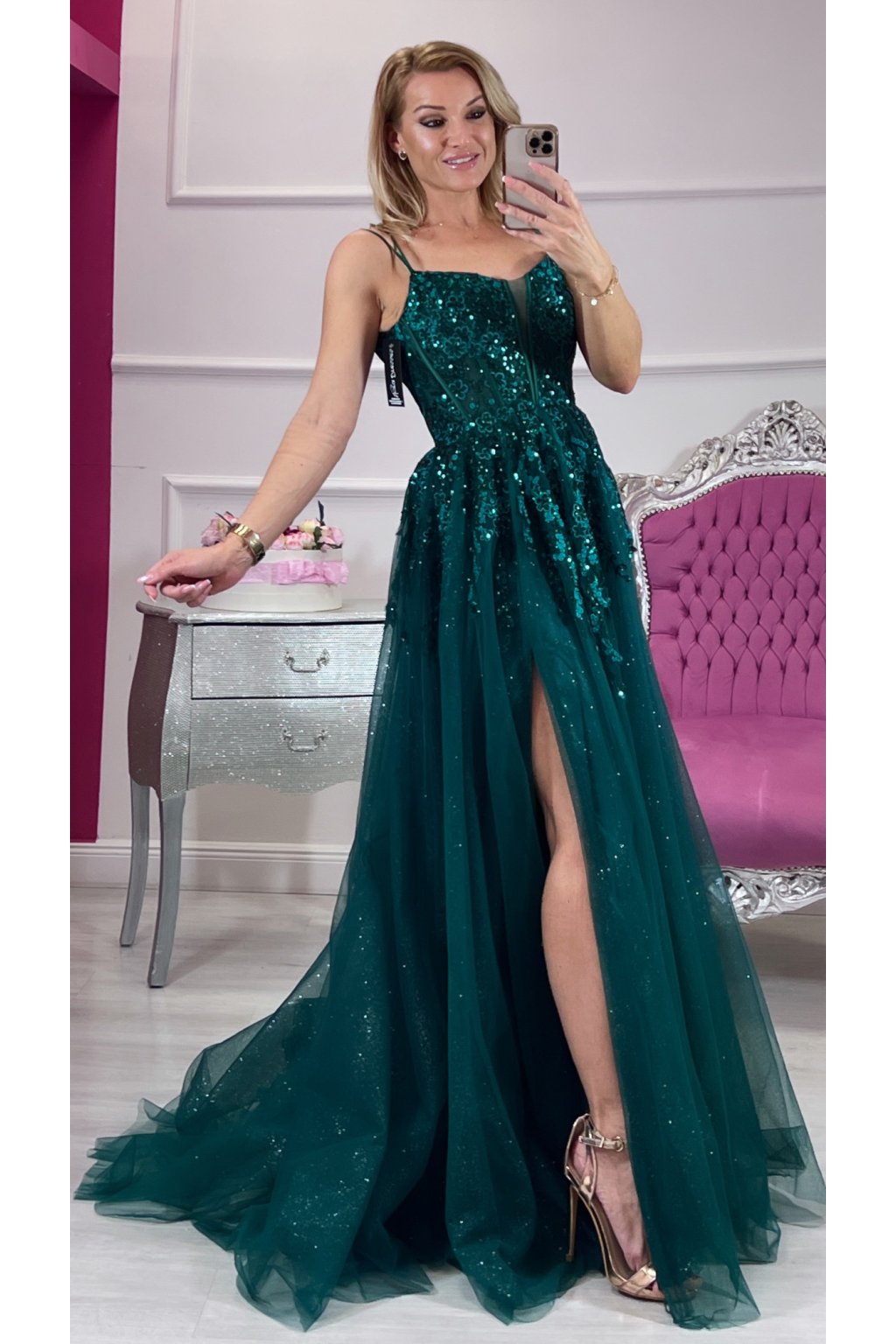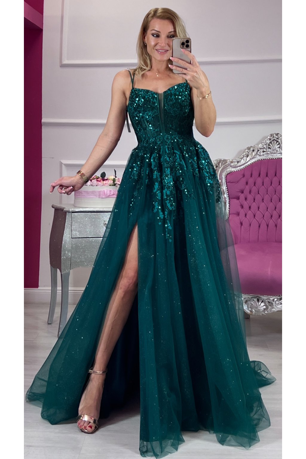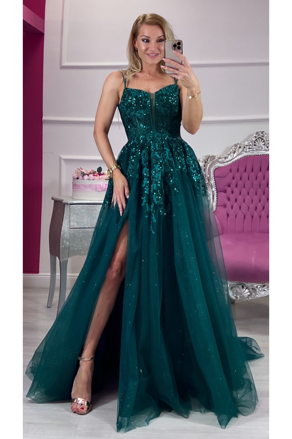 Zahaľ sa do noblesy moderného rozprávkového sveta. Tieto zelené tylové princeznovské šaty s bohatým flitrovým zdobením žiaria pri každom kroku a okamžite pritiahnu pozornosť. Korzetový strih so šnurovaním na chrbte dokonale vytvaruje postavu, nastaviteľné ramienka a výstuž sa postarajú o pohodlie aj istotu.