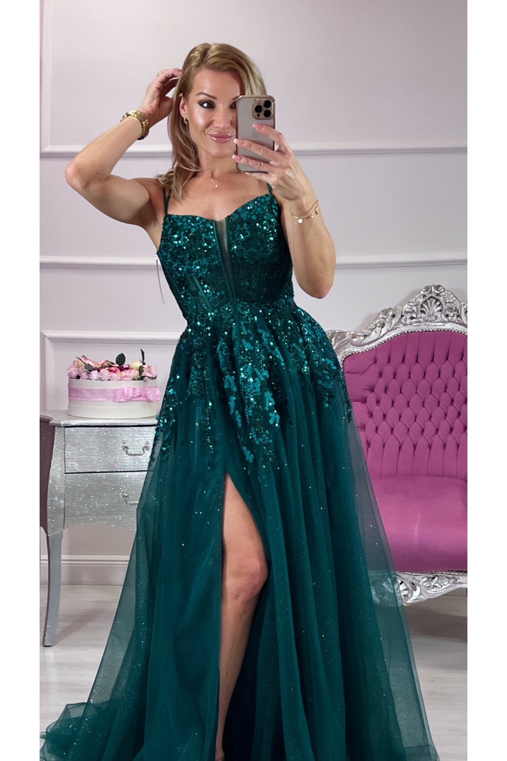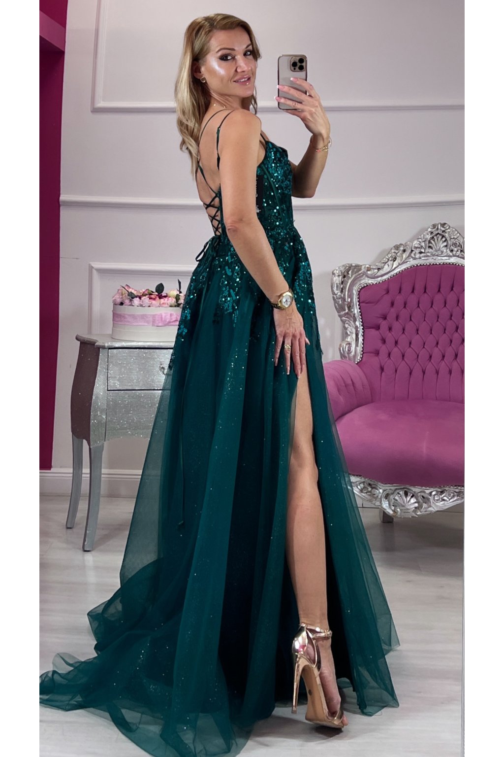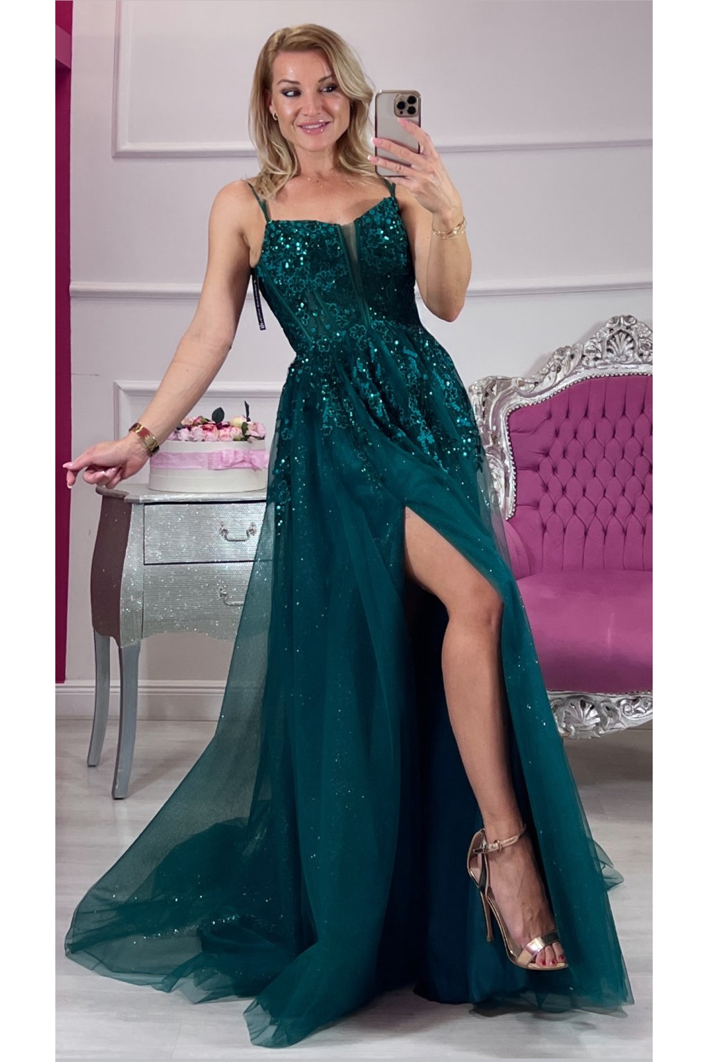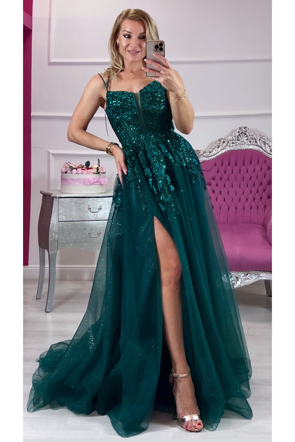 Zahaľ sa do noblesy moderného rozprávkového sveta. Tieto zelené tylové princeznovské šaty s bohatým flitrovým zdobením žiaria pri každom kroku a okamžite pritiahnu pozornosť. Korzetový strih so šnurovaním na chrbte dokonale vytvaruje postavu, nastaviteľné ramienka a výstuž sa postarajú o pohodlie aj istotu.