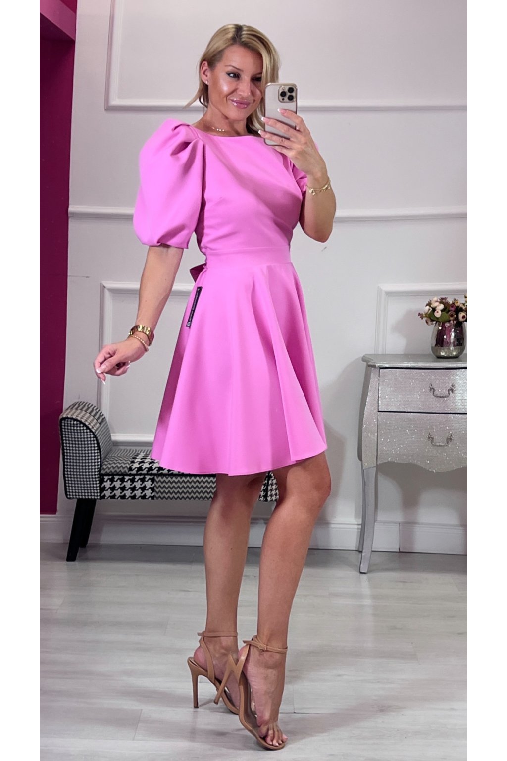 Elegantné krátke šaty s krátkym rukávom .Šaty majú jednoduchý strich, vpredu člnkový výstrich ale vzadu s výstrichom v tvare V. Podprsenka sa krásne zmestí pod šatami. Šaty sa zapínajú vzadu na zips. Šaty majú mierne elastický material a vzadu je ešte našitá stuha na mašničku aby sa krásne prispôsobili k postave.