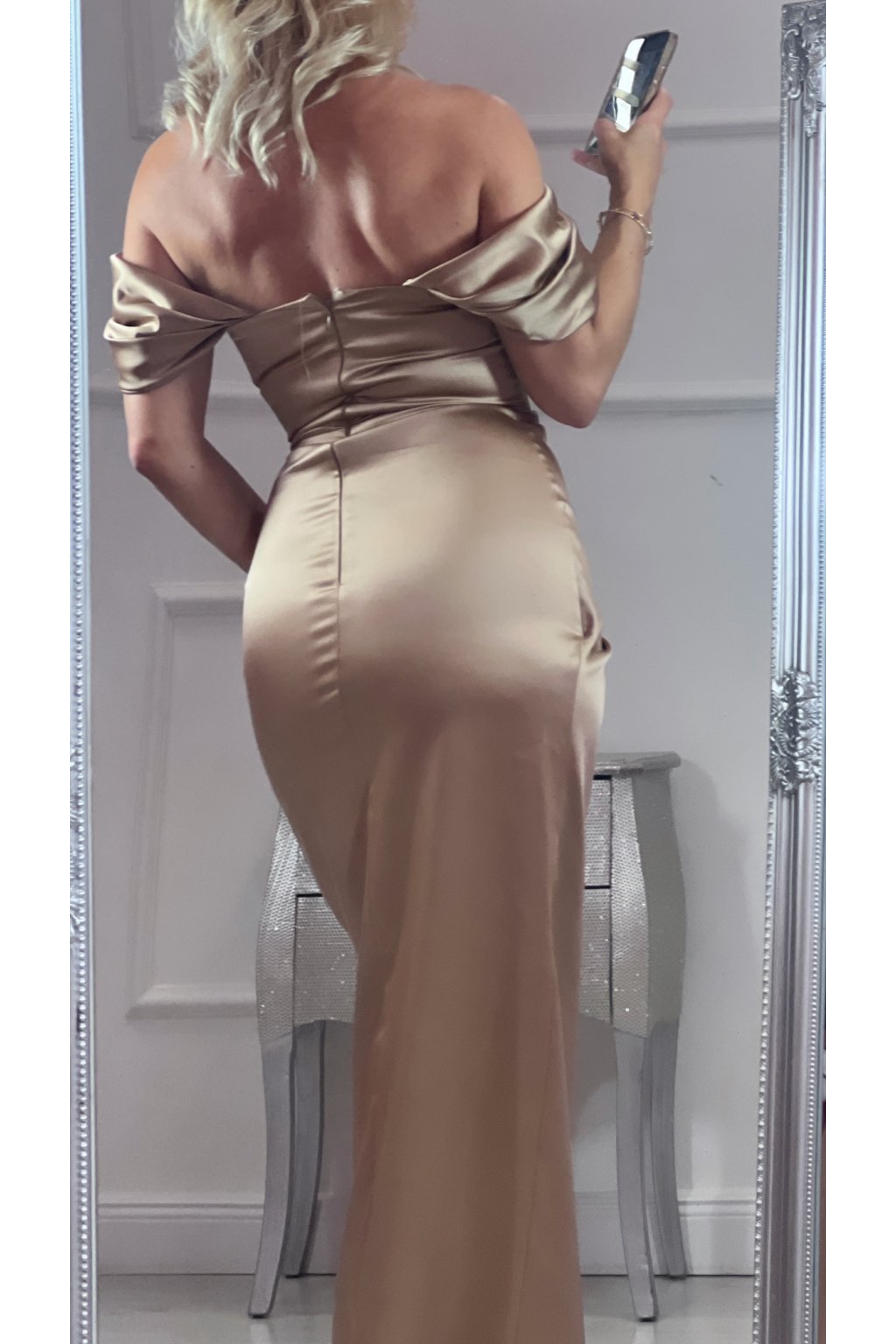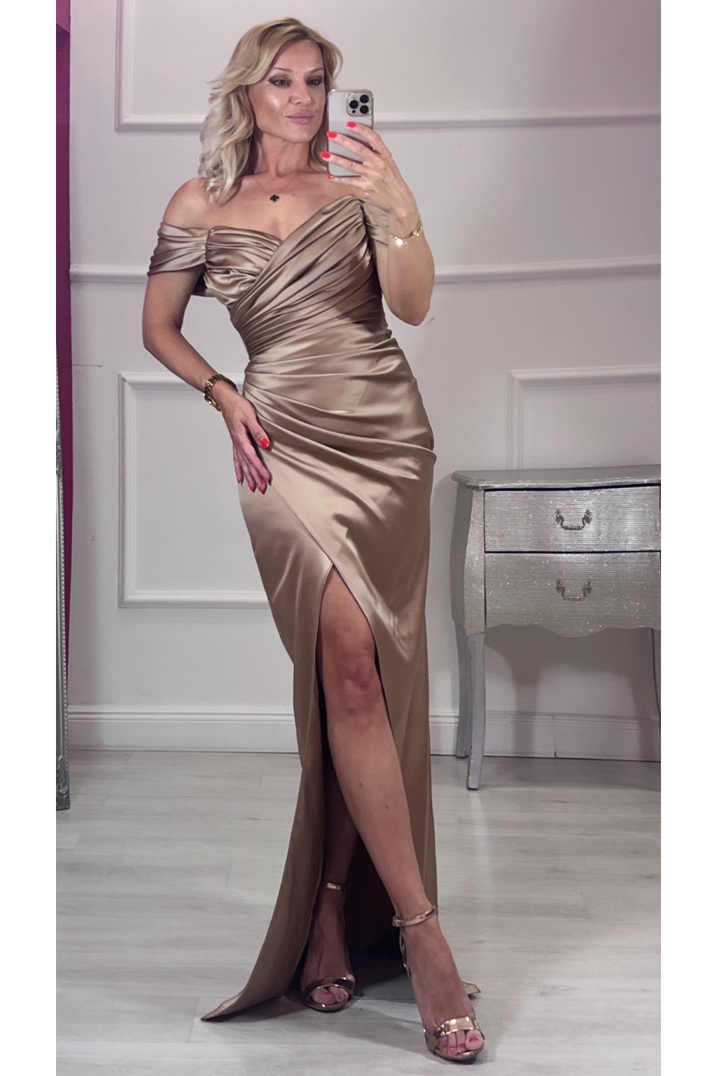 Tieto zlatohnedé saténové šaty pôsobia mimoriadne sofistikovane a ženský pôvab z nich doslova vyžaruje. Ich priliehavý strih nádherne obopína postavu a zvýrazňuje krivky, zatiaľ čo jemne spadnuté ramienka dodávajú outfitu romantický a zmyselný nádych. Vpredu decentný rozparok odhaľuje nohu s vkusom a ľahkosťou, čo pridáva na elegancii aj sebavedomí. Zabudovaná výstuž poskytuje oporu bez nutnosti podprsenky, a rafinované strihové riešenie v oblasti brucha šikovne maskuje drobné nedokonalosti, vďaka čomu sa v nich každá žena môže cítiť krásne a pohodlne