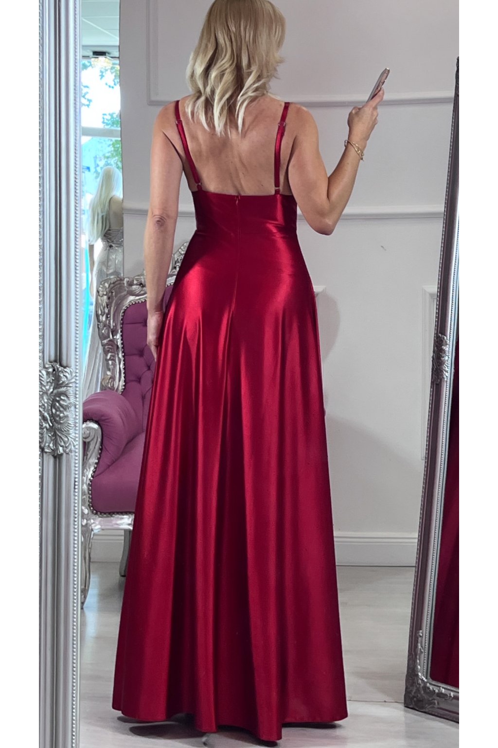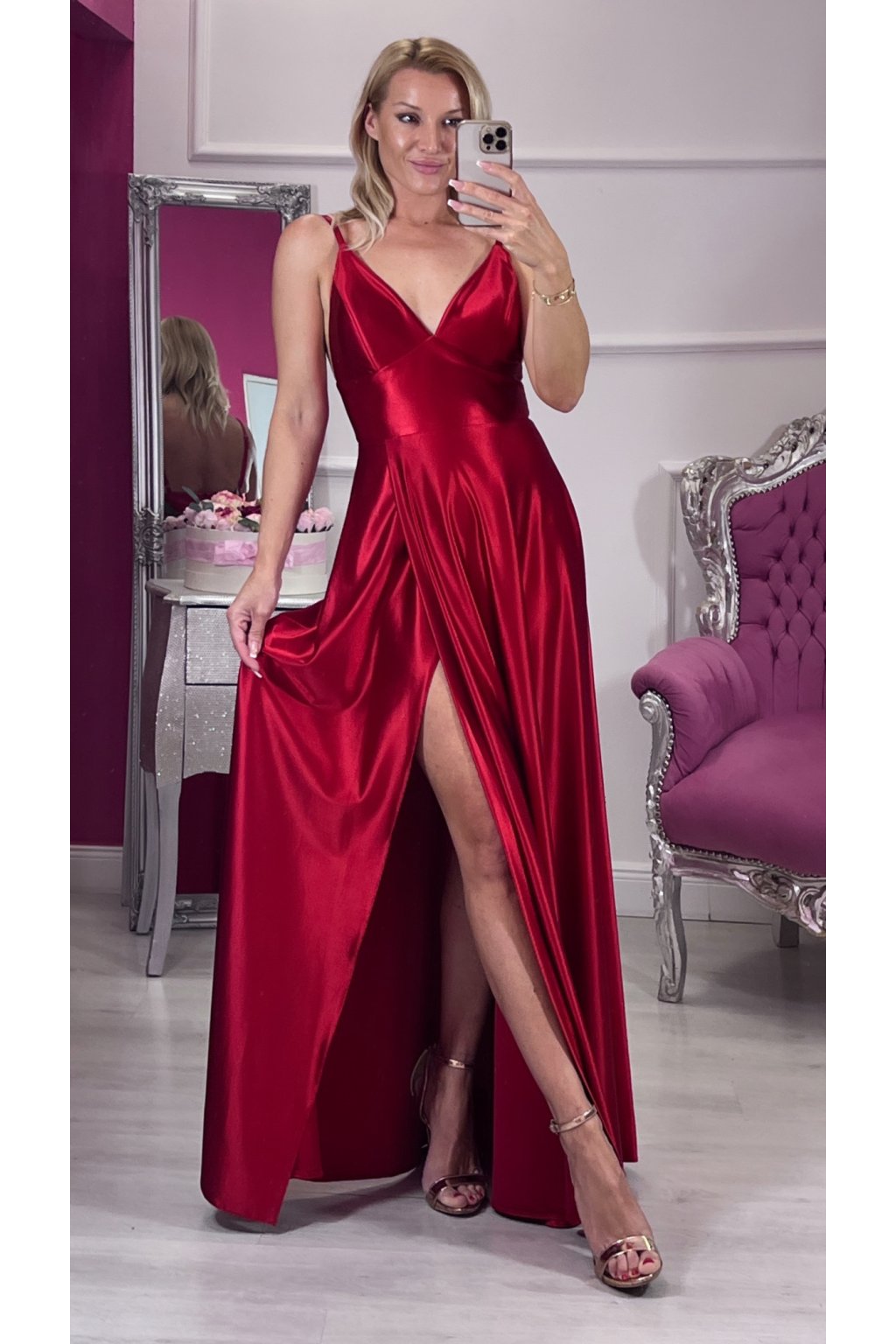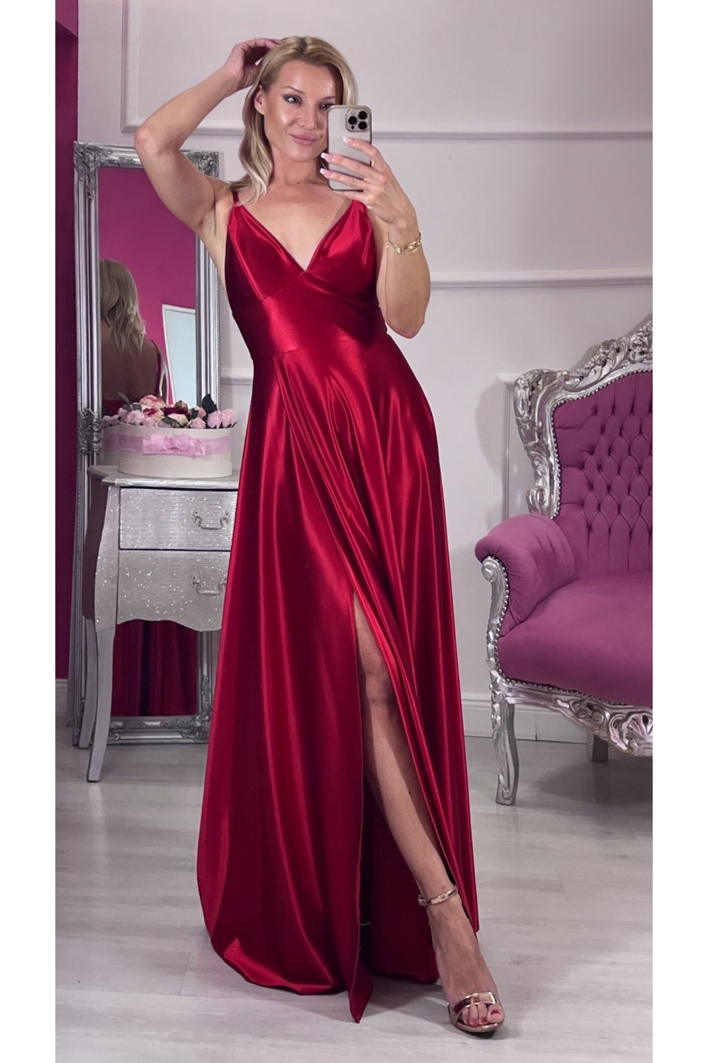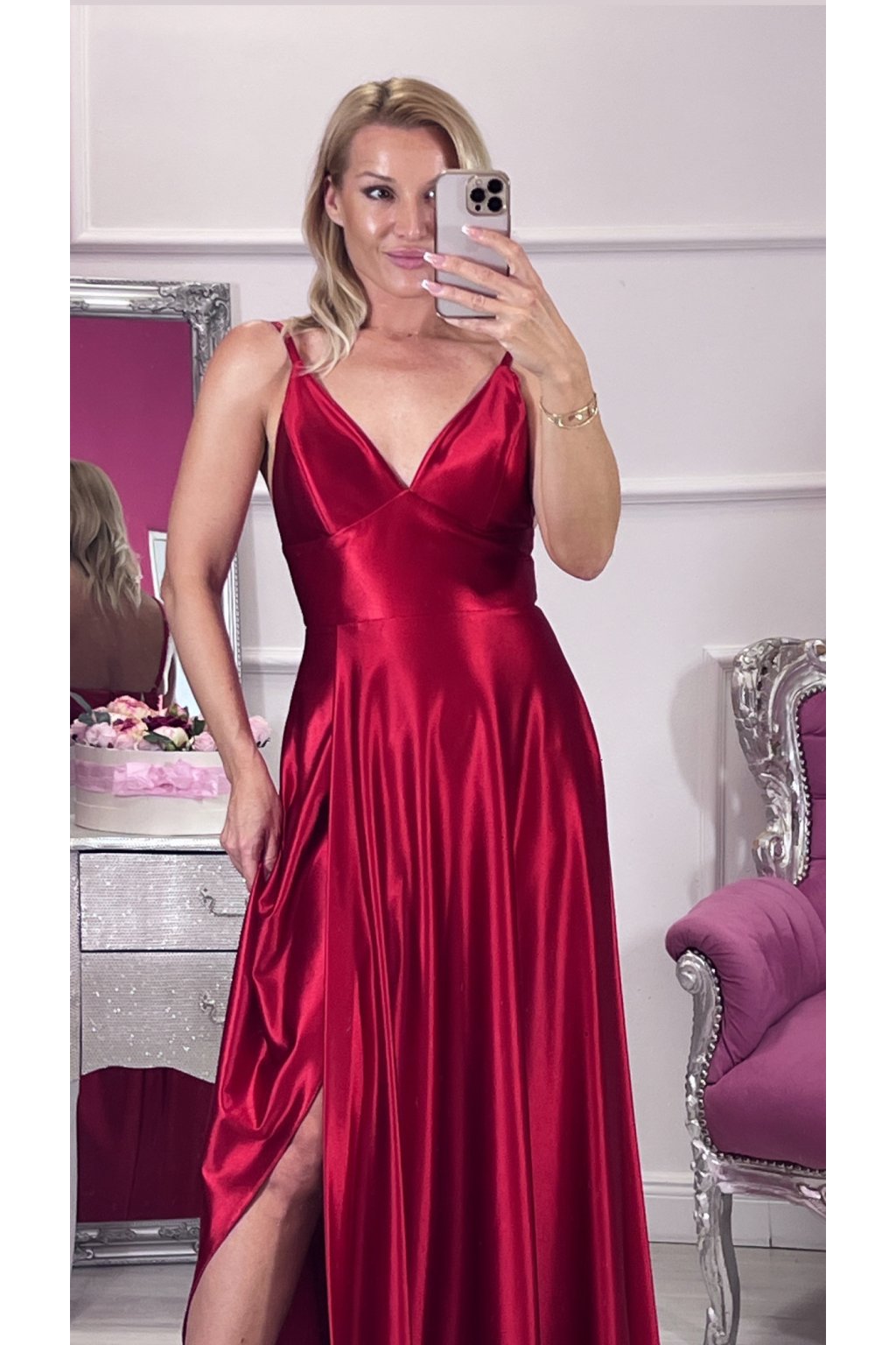 Tieto nádherné červené šaty vyžarujú čistý luxus. Dlhá línia s rozparkom a sofistikovaným výstrihom pôsobí zvodne aj elegantne zároveň. Jemné nastaviteľné ramienka, odhalený chrbát a diskrétne všitá podprsenková výstuha dotvárajú ich exkluzívny, no pritom stále nadčasovo jednoduchý charakter.