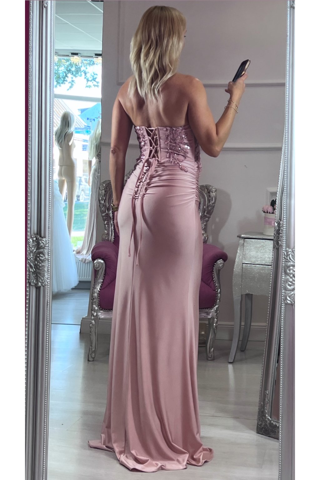Luxusné saténové šaty s priliehavým strihom, ktoré dokonale zvýraznia siluetu. Korzetová čipkovaná vrchná časť s kosticami a výstužou pôsobí elegantne a zvodne, odopínateľné ramienka umožňujú variabilný vzhľad. Zapínanie na zips a šnurovanie vzadu zaručuje perfektné prispôsobenie. Predný rozparok na sukni dodáva modelu rafinovaný a pôvabný akcent.