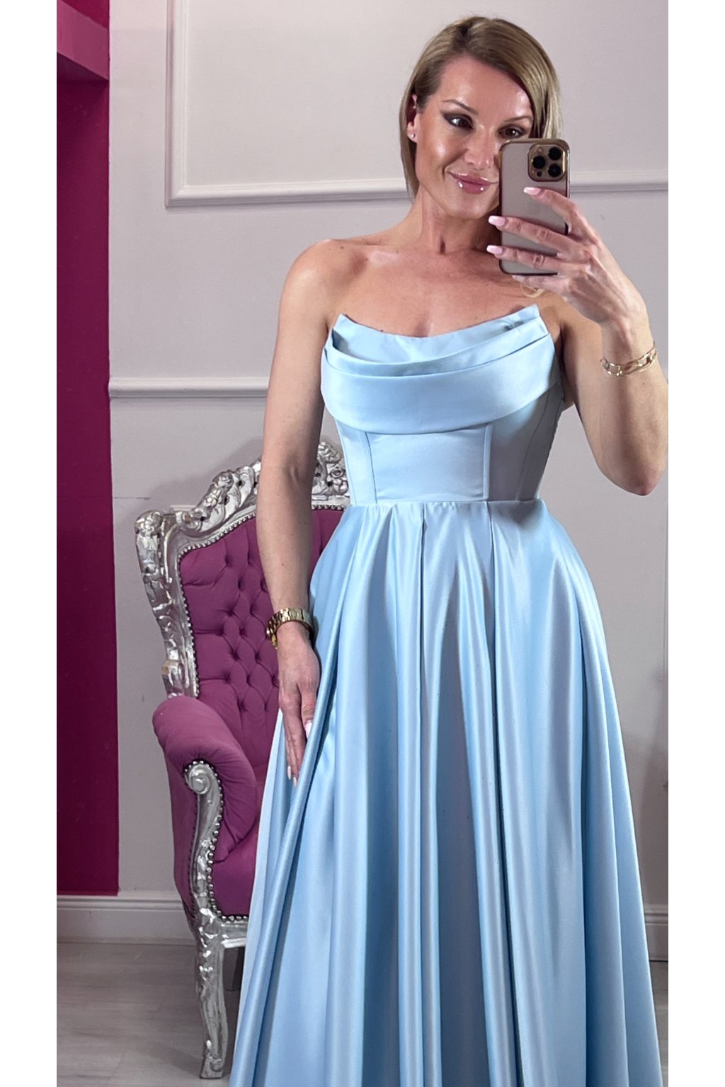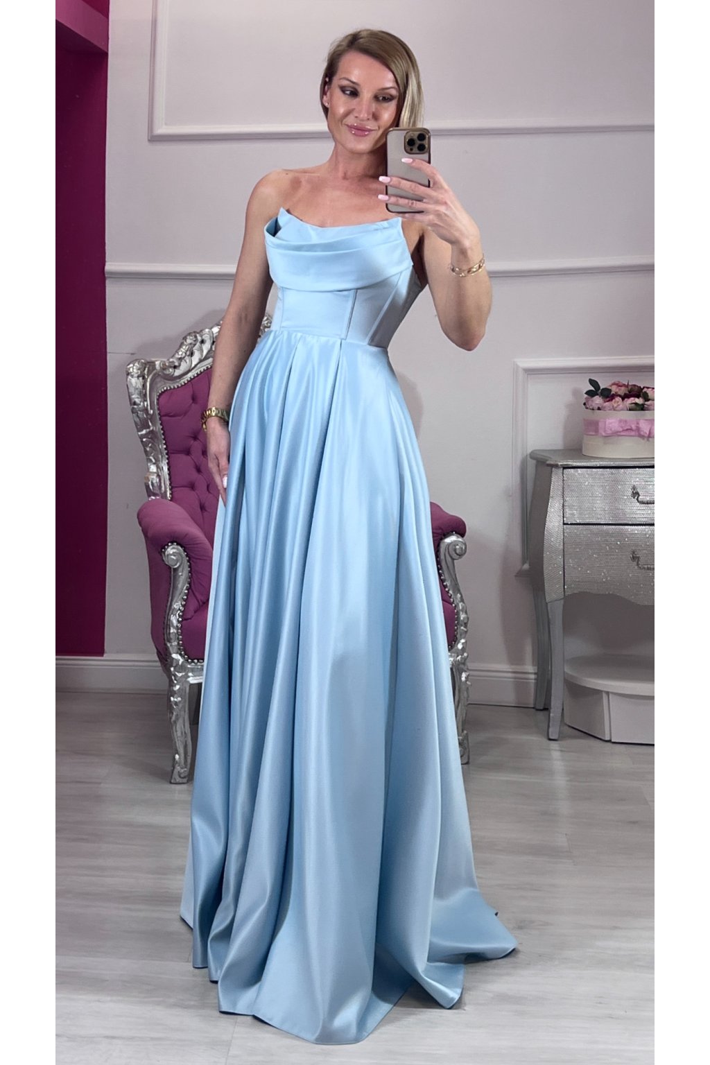 Zahaľte sa do elegancie, ktorá nikdy nevyjde z módy. Tieto nádherné dlhé A-čkové šaty zaujmú na prvý pohľad svojou ženskou siluetou a výraznou farbou. Korzetový živôtik s pevnou výstužou dokonale tvaruje postavu a poskytuje spoľahlivú oporu – šitá podprsenka zabezpečí pohodlie aj bez ďalších doplnkov.