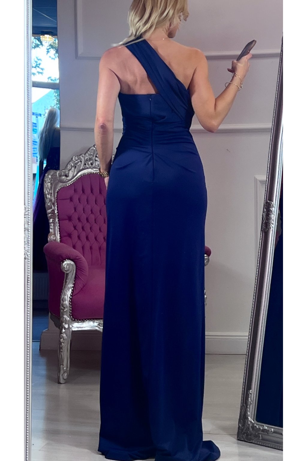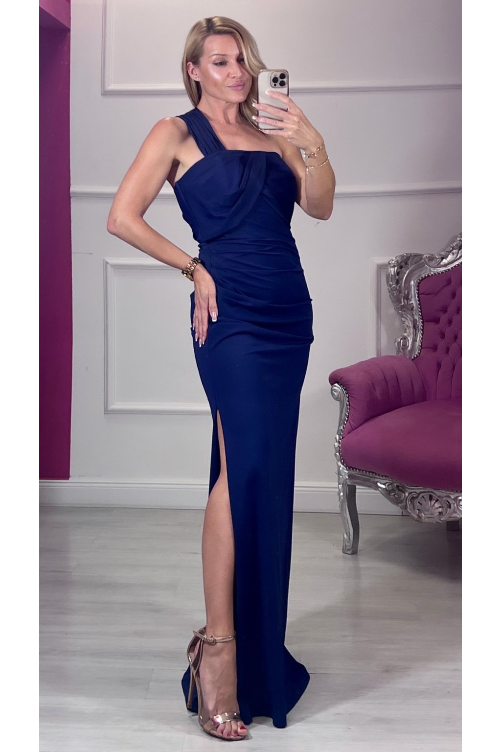 Tmavomodré priliehavé spoločenské šaty na jedno rameno