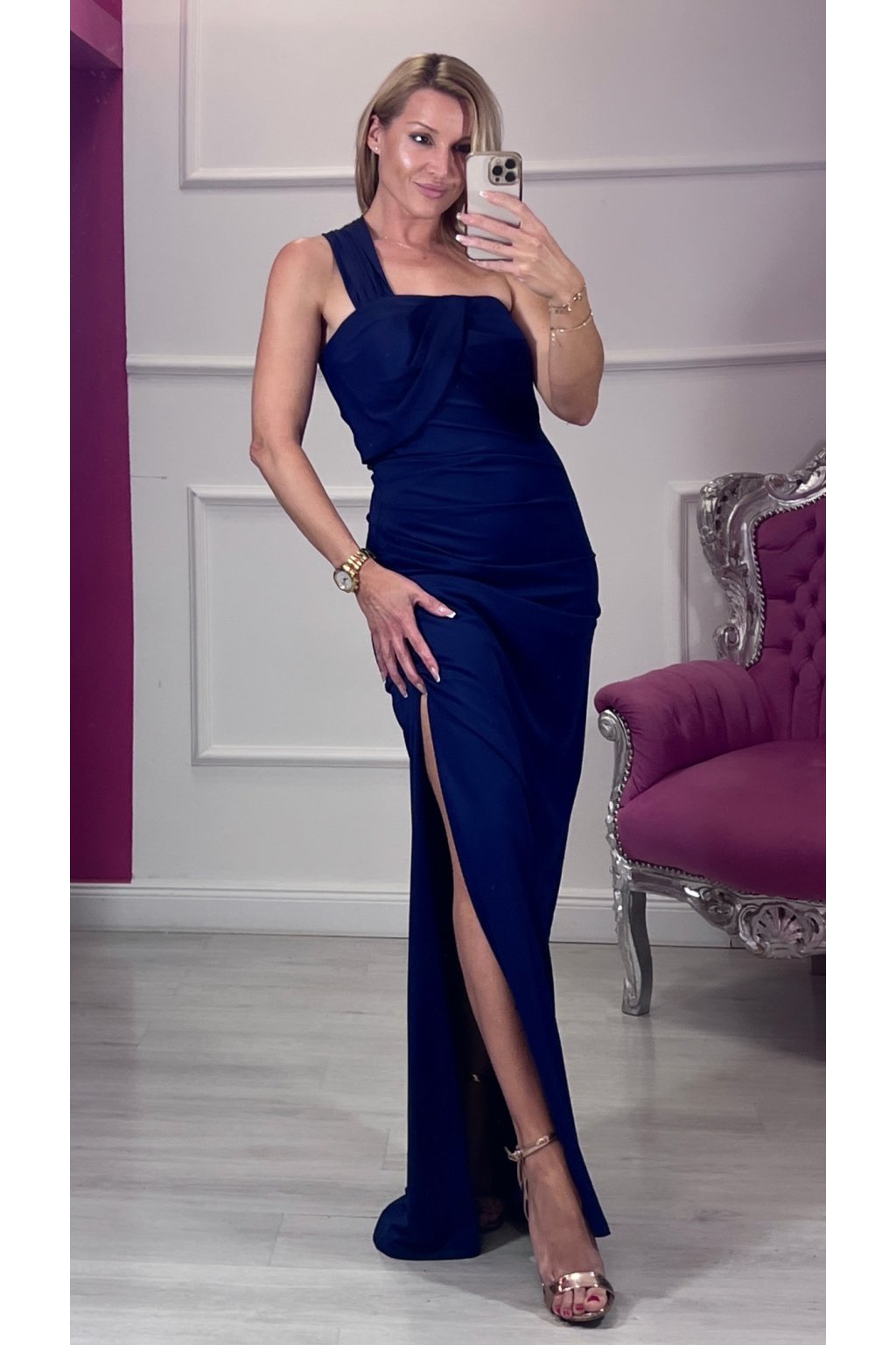 V týchto nádherných dlhých šatách v odtieni hlbokej námorníckej modrej zažiariš pri každej príležitosti. Priliehavý strih dokonale kopíruje krivky tela, zatiaľ čo jemne zberkaná látka v oblasti bruška a zadočku lichotí postave a vytvára harmonickú siluetu. Asymetrický strih na jedno rameno dodáva šatám sofistikovaný nádych, zatiaľ čo rozparok vpredu zaisťuje zmyselnosť a ženskosť. Zapínanie na skrytý zips vzadu podčiarkuje ich čistý, elegantný vzhľad.