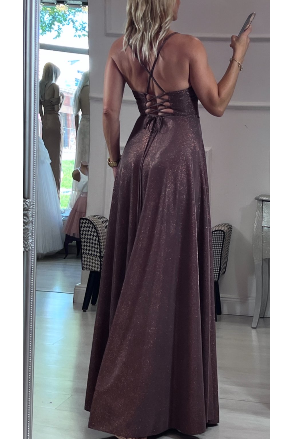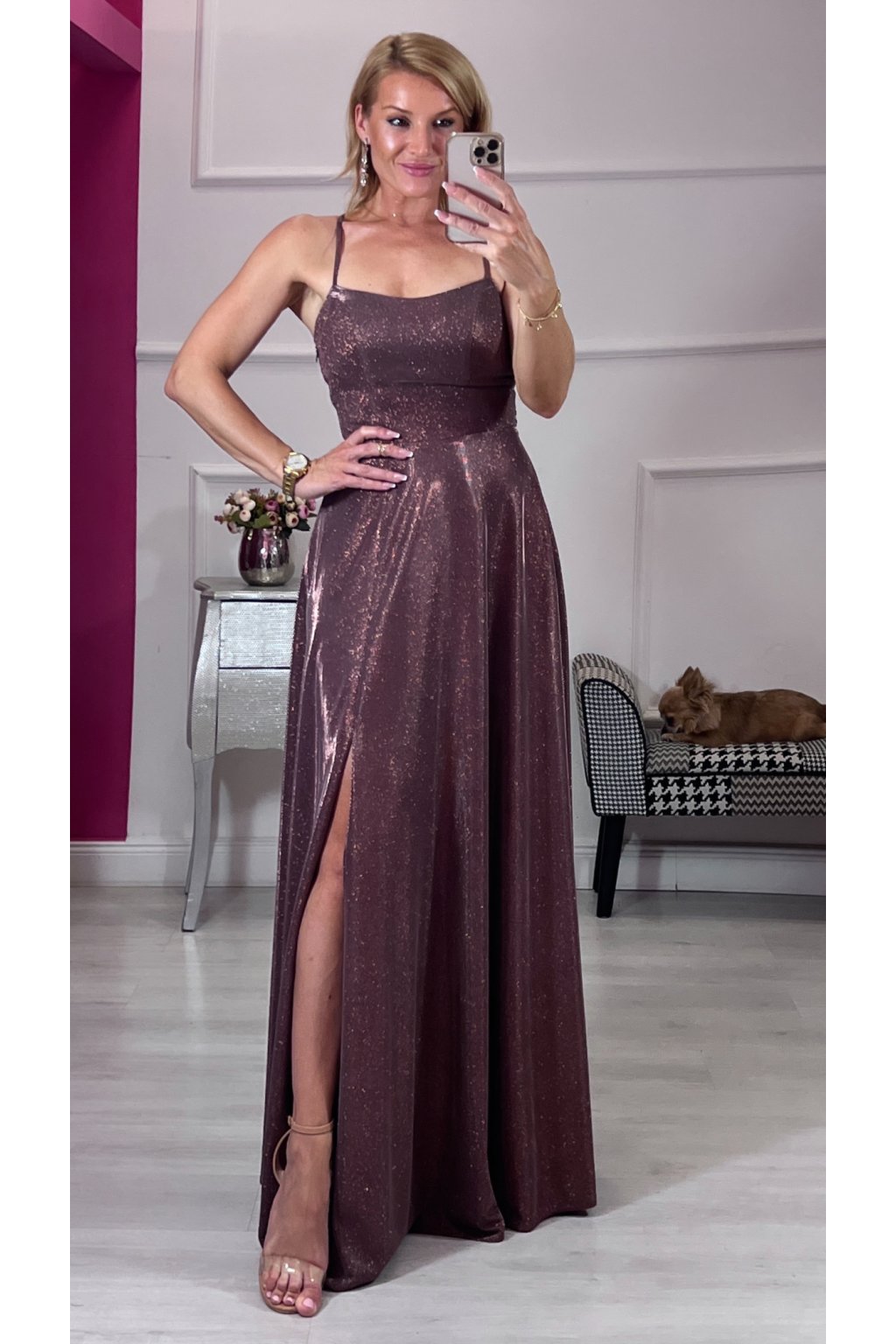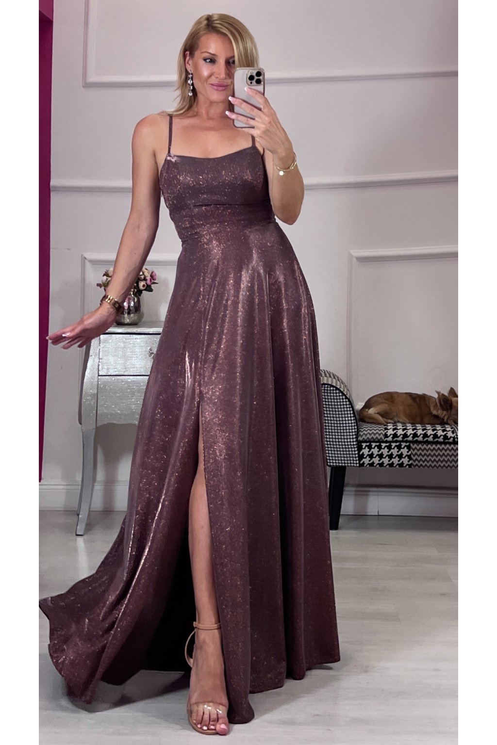 Elegantné spoločenské šaty v zemitom odtieni, ušité z jemne trblietavej látky, ktorá nádherne padá a vytvára pôsobivý efekt pri každom pohybe. Zadná časť je riešená šnurovačkou doplnenou o skrytý zips, čo zaručuje dokonalé prispôsobenie postave. Šaty nemajú výstuž, vďaka čomu pôsobia prirodzene a vzdušne. Efektný rozparok dodáva modelu jemný nádych zmyselnosti a elegancie. Ideálna voľba pre výnimočné príležitosti.