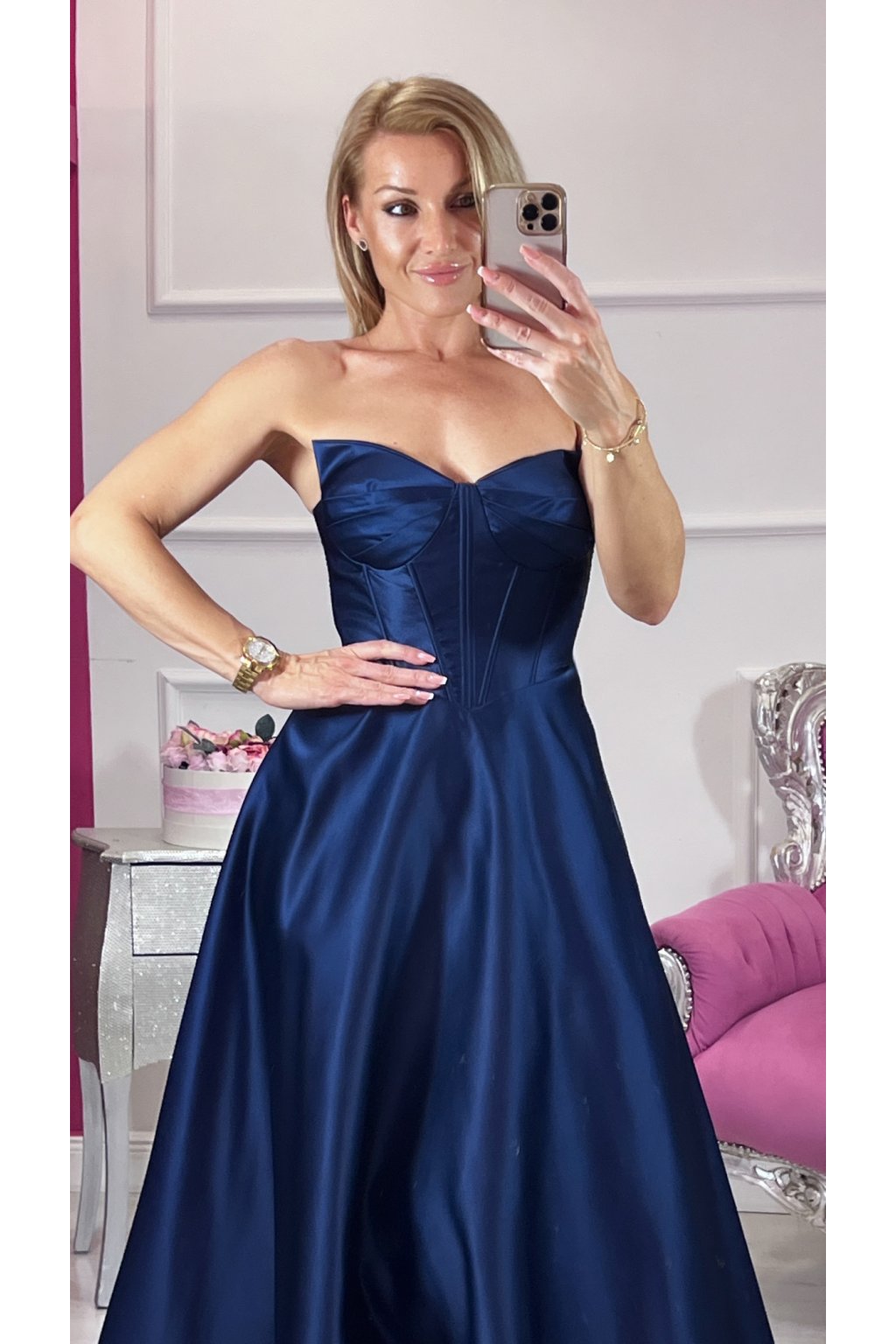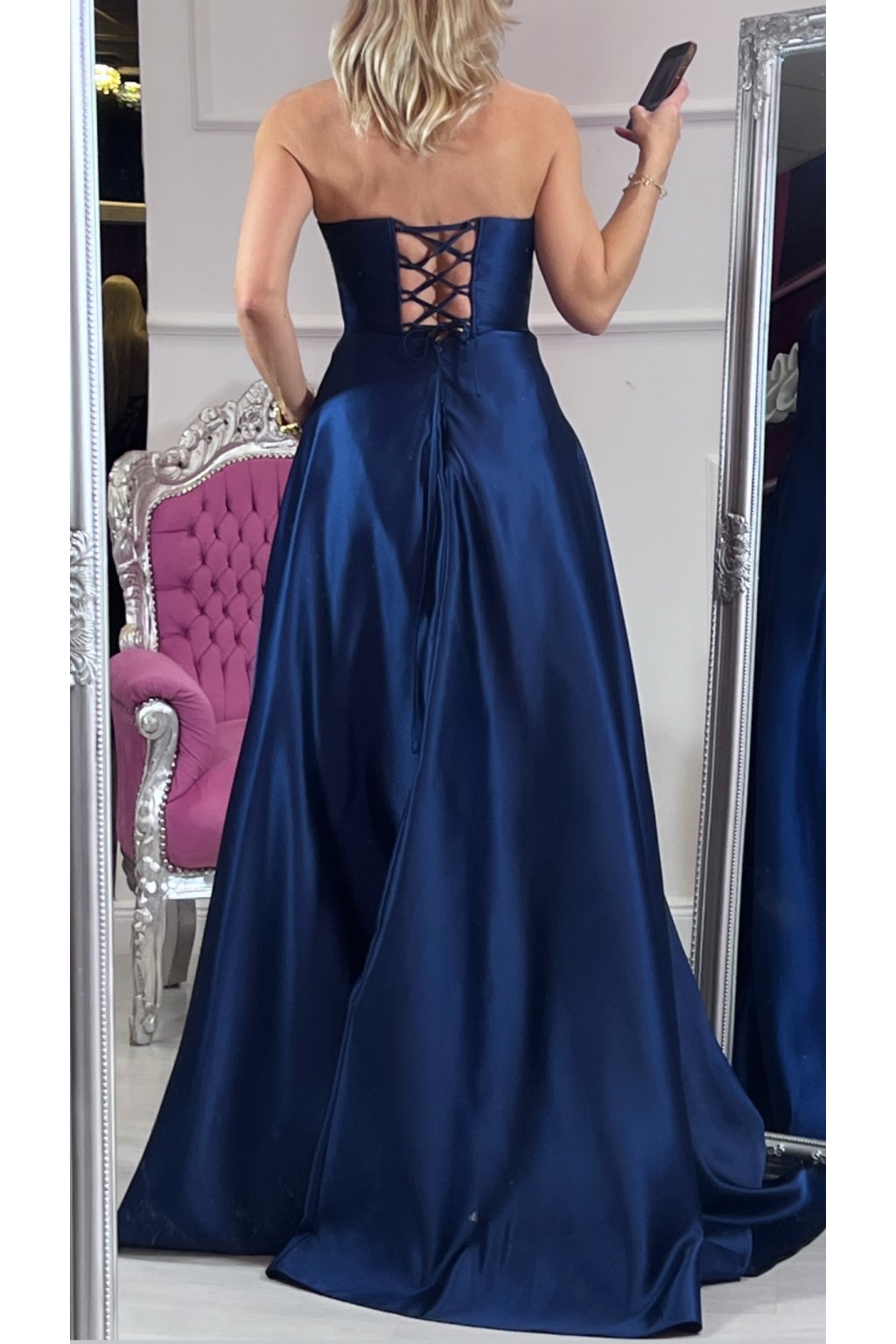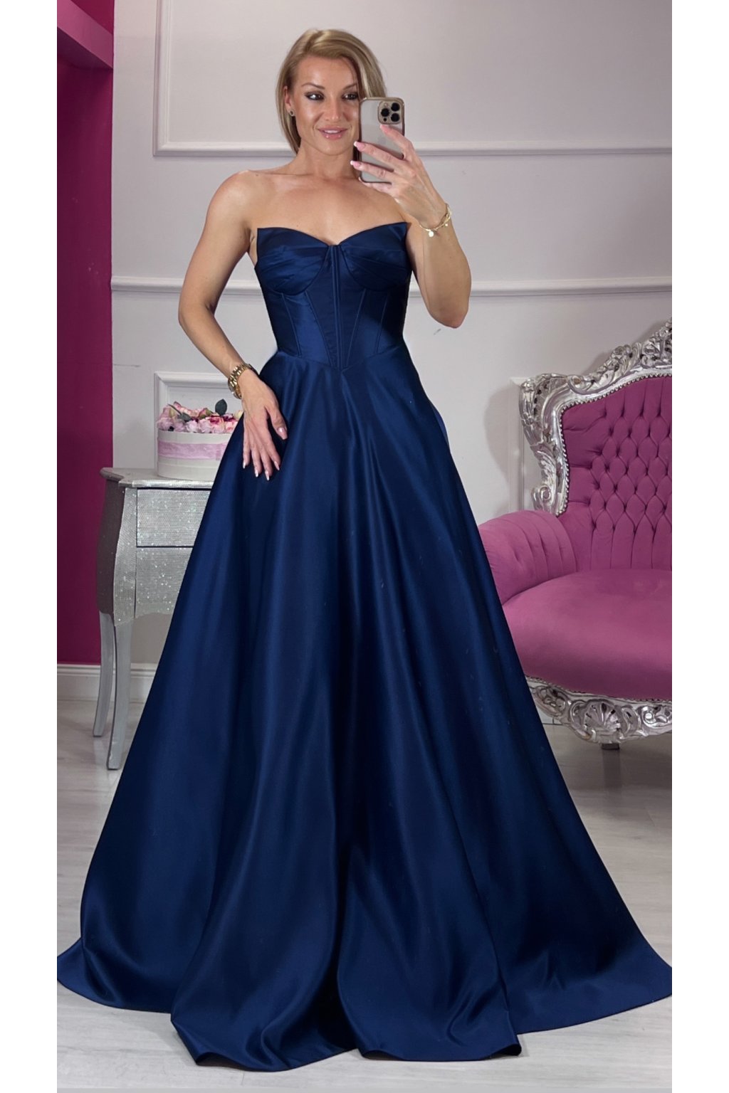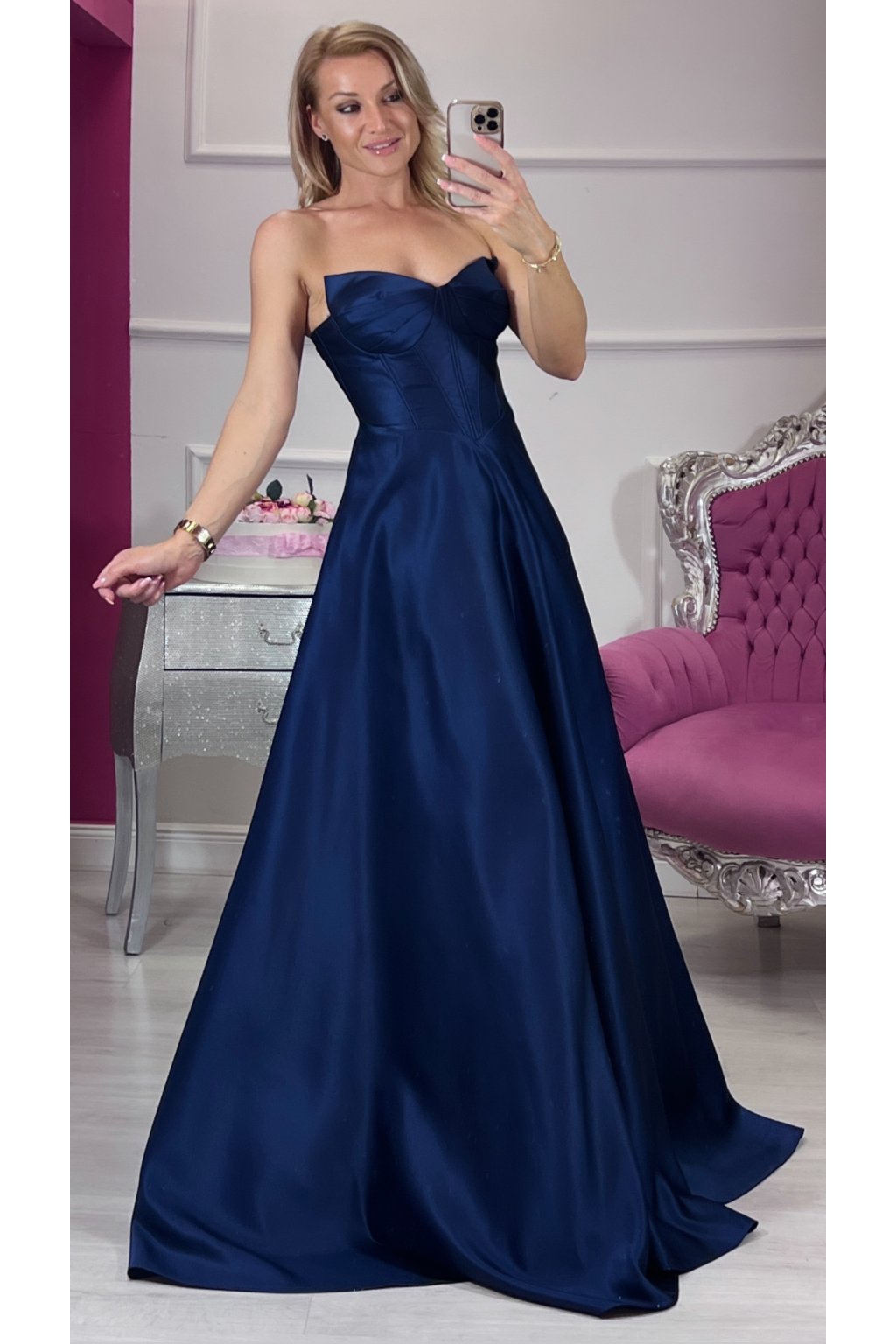 💙Tieto korzetové šaty v námorníckej modrej farbe spájajú luxus, eleganciu a zmyselnosť v jednom. Pevný korzet s kosticami a šnurovačkou krásne tvaruje postavu, podprsenková vystužená časť dodáva oporu a rafinovaný vzhľad. Bohatá, štýlovou látkou riasená suknička pôsobí honosne a výrazne, no zároveň zostáva jemná a ženská. Šaty sú doplnené o ramienka pre variabilné nosenie. Ideálny kúsok pre výnimočné príležitosti, ktorý zaručene zaujme.